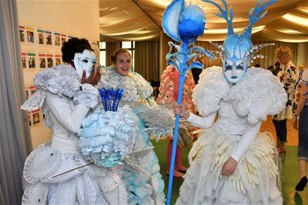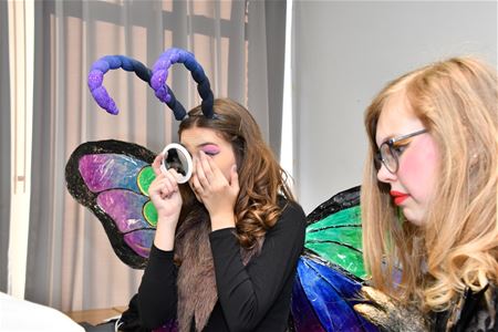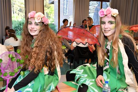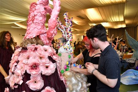 Tijdens de pauze is het een heel gedoe in de kleedkamer van de modeshow. Wie het eerste deel achter de rug heeft, zit wat na te puffen van de warmte en de spanning. Niet te onderschatten trouwens in die speciale pakken. De andere mannequins worden nog klaargestoomd door de leerkrachten, wat schmink op het gezicht, een pruik rechtgezet, de laatste details aan de kleding bevestigd. "t Was wel even stresserend vlak voor we de catwalk op moesten, maar eenmaal op de planken viel dat van ons af," vertellen Daphe en Jordy die het defilé moesten openen. "We hebben hier echt wel lang en hard aan gewerkt, en dan wil je dat het goed gaat. Jammer dat het zo kort is, maar gelukkig hebben we morgen nog een show." (meer foto's)