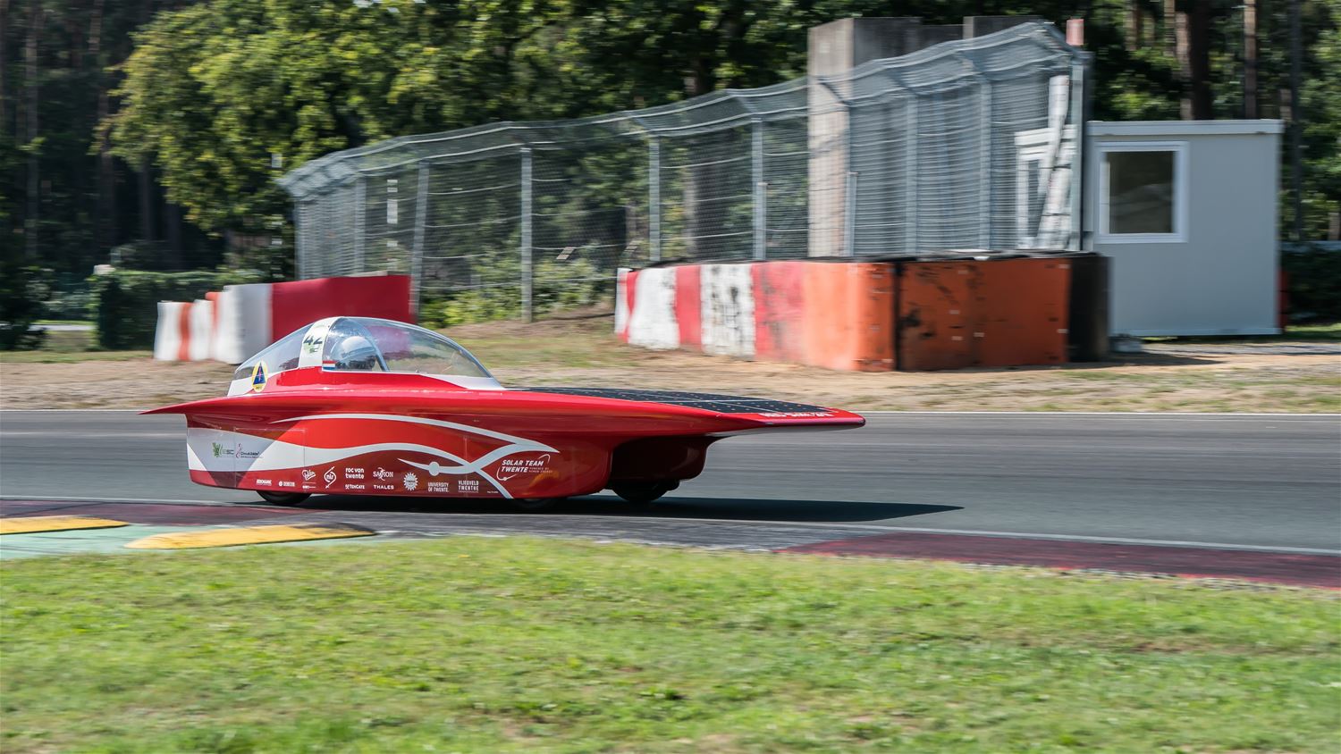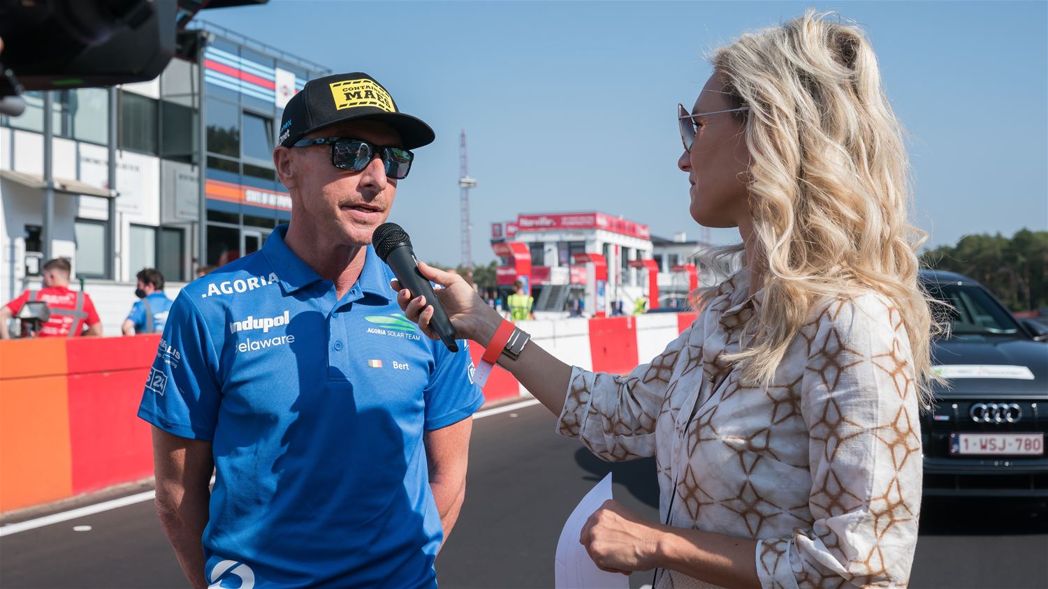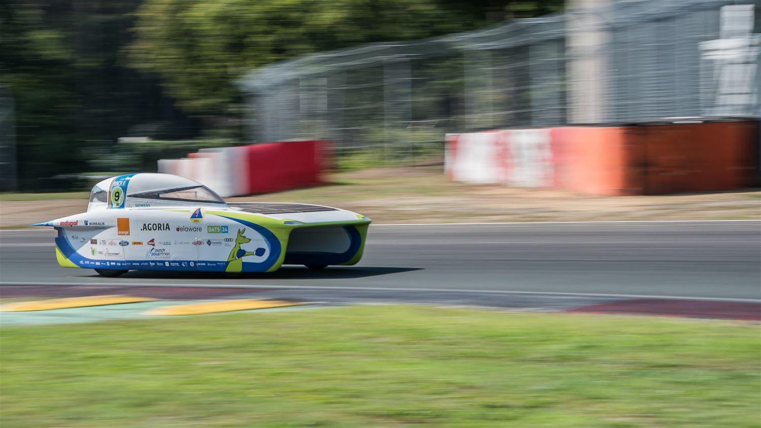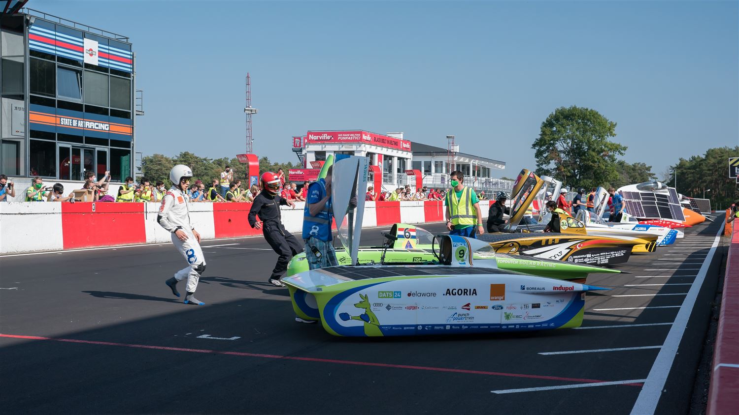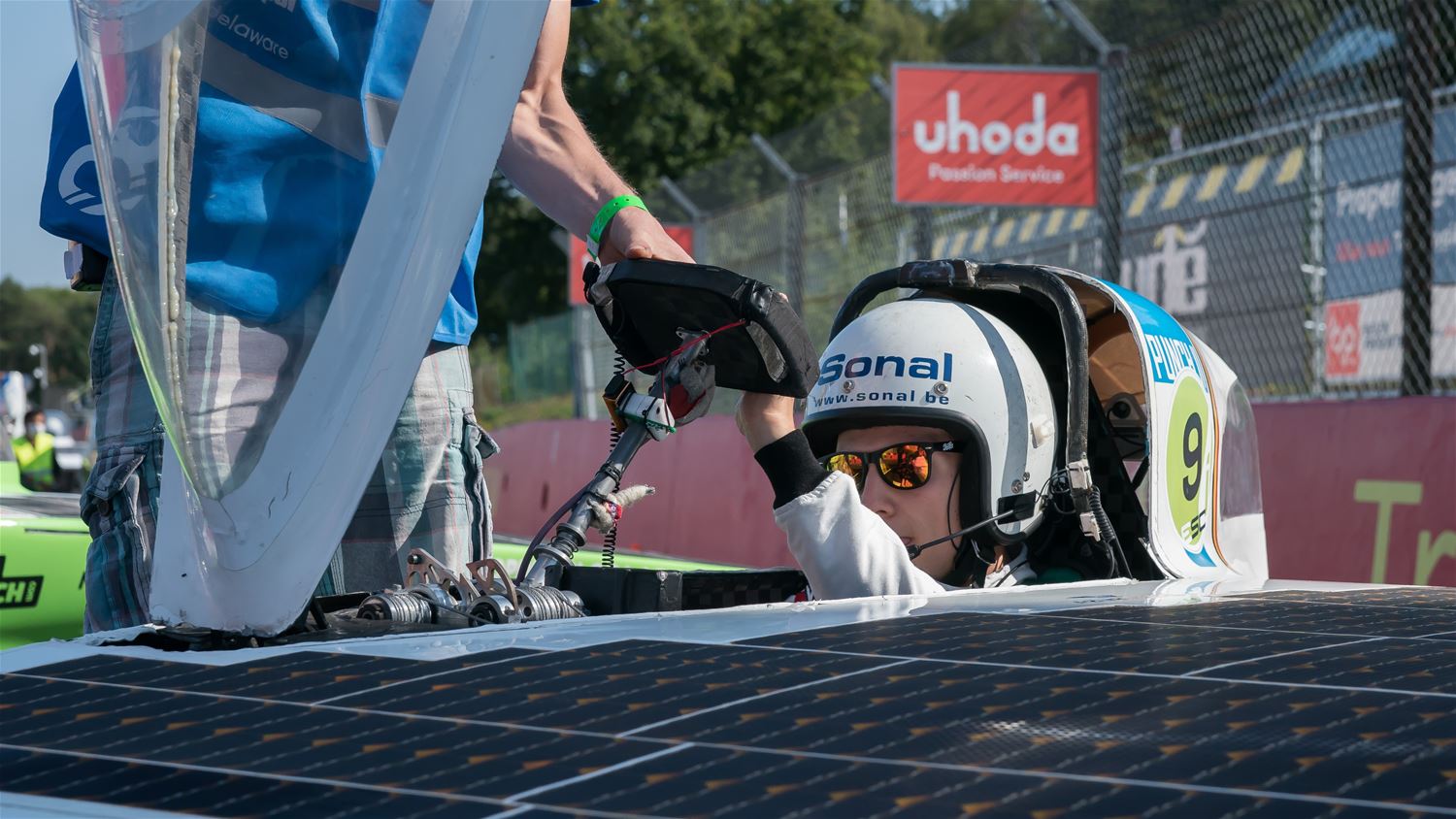 Deze namiddag heeft Vlaams minister van mobiliteit Lydia Peeters de start gegeven van de 24 uurs race voor zonnewagens op Circuit Zolder. Dat gebeurde heel gepast onder een stralende zon. De rijders namen een Le Mans start en gingen er meteen tegenaan. Vanavond reed het Belgische Agoria Solar Team met een stevige voorsprong aan de leiding, met 149 rondes. Dat waren er liefst 15 meer dan Top Dutch Solar Team en 24 meer dan Solar Team Twente. Afwachten of ze die bonus heel de nacht en ochtend door kunnen behouden. (foto's Dirk Dekens)