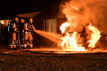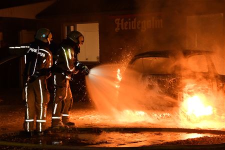 In Berkenbos is zaterdagavond laat een auto volledig uitgebrand. De kleine personenwagen stond geparkeerd tegen het gebouw van harmonie De Heidegalm waar op dat ogenblik een feest aan de gang was. Het vuur moet kort voor half twaalf ontstaan zijn, de auto stond meteen in lichterlaaie. De vlammen beschadigden ook de dakgoot van het gebouw en de ramen en muren waren zwartgeblakerd. De brandweer kon een verdere uitbreiding voorkomen, maar de auto is totaal uitgebrand. (foto's Michiel Reynders)43407