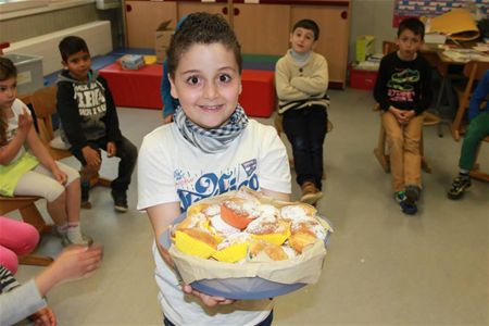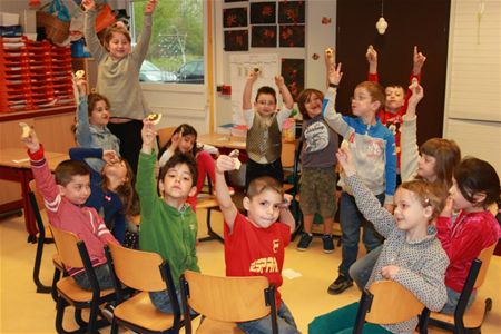 De kinderen van het eerste leerjaar van Beekbeemden hebben de paasvakantie ingezet met een stevig feestje. Iedereen stak de handen uit de mouwen zodat er gesmuld kon worden van cake, koekjes, chips, snoepjes ... Er werden moppen verteld, een zelfgemaakt lied gezongen, gezelschapsspelletjes gespeeld... Elke klas kreeg hoog bezoek: zanger Paco trad op voor de leerlingen van 1a en in 1b stal kip Pluimpje de show. (foto's Katelijne Beerten)15743