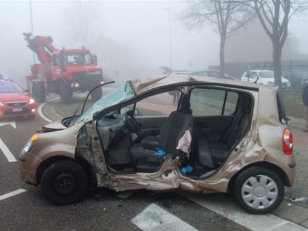 De vrouw die voor de middag bij een verkeersongeval in Zonhoven levensgevaarlijk gewond raakte, is een 80-jarige inwoonster van Heusden-Zolder. Ze kwam met haar auto uit de Zavelstraat, waar ze inkopen was gaan doen in de Colruyt, en wilde de N74 (Hasselt-Eindhoven) oversteken. Daar werd ze gegrepen een een vrachtwagen, de brandweer moest haar bevrijden. Eén van beide bestuurders is volgens de politie door het rode licht gereden. Mogelijk speelde de dichte mist een rol bij het ongeval. De vrachtwagenchauffeur, een man uit Durbuy, raakte eveneens gewond. (foto's Patrick Rouwet)