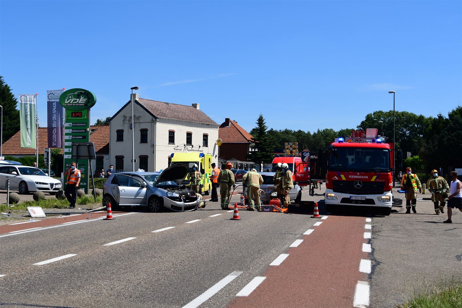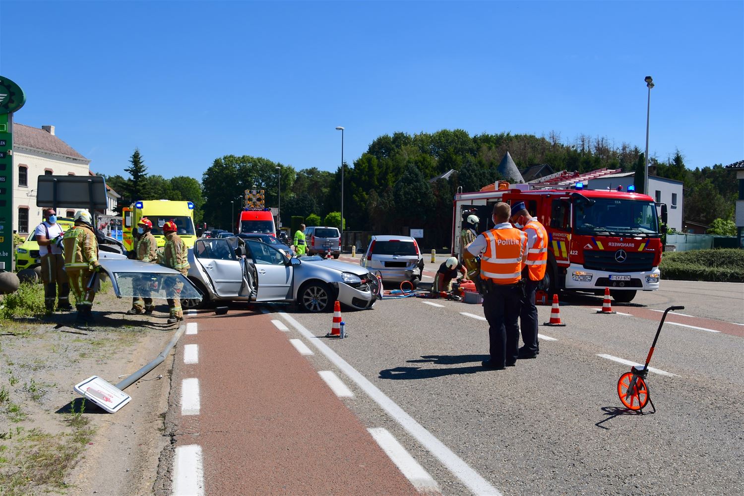 UPDATE Na ongeveer een half uur was het slachtoffer bevrijd en voldoende stabiel om naar het ziekenhuis in Heusden af te voeren. Een 23-jarige bestuurder uit Diest raakte zwaargewond, hij is volgens de vaststellingen ingereden op een stilstaande auto. In de andere auto raakte een vrouw lichtgewond. (foto's Michiel Reynders) 59561