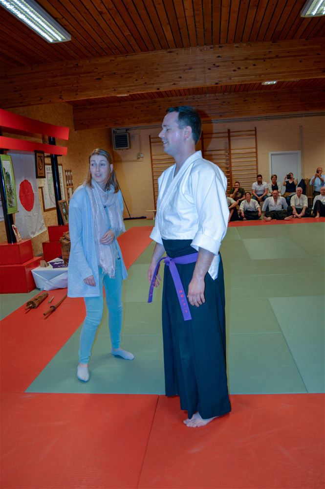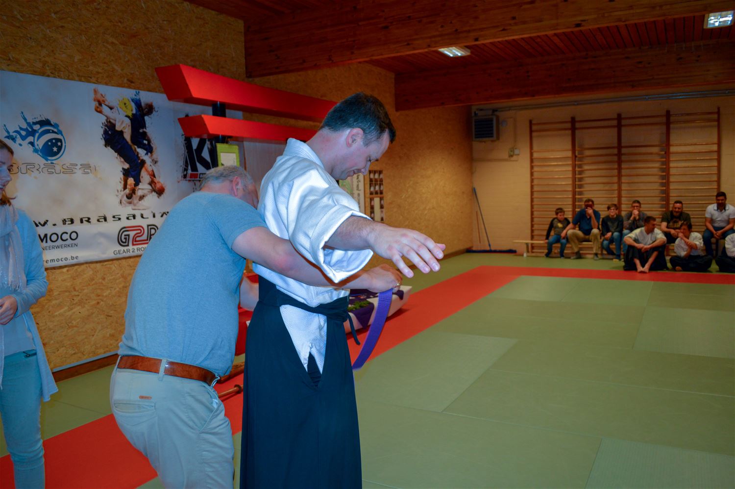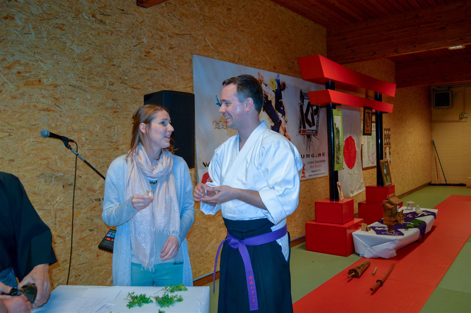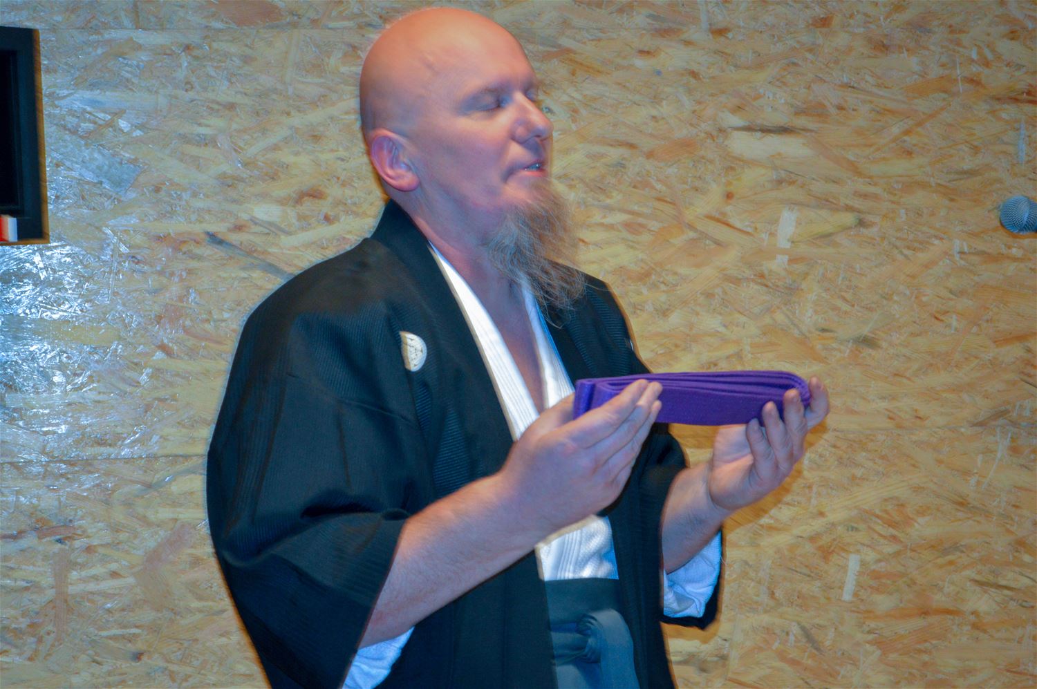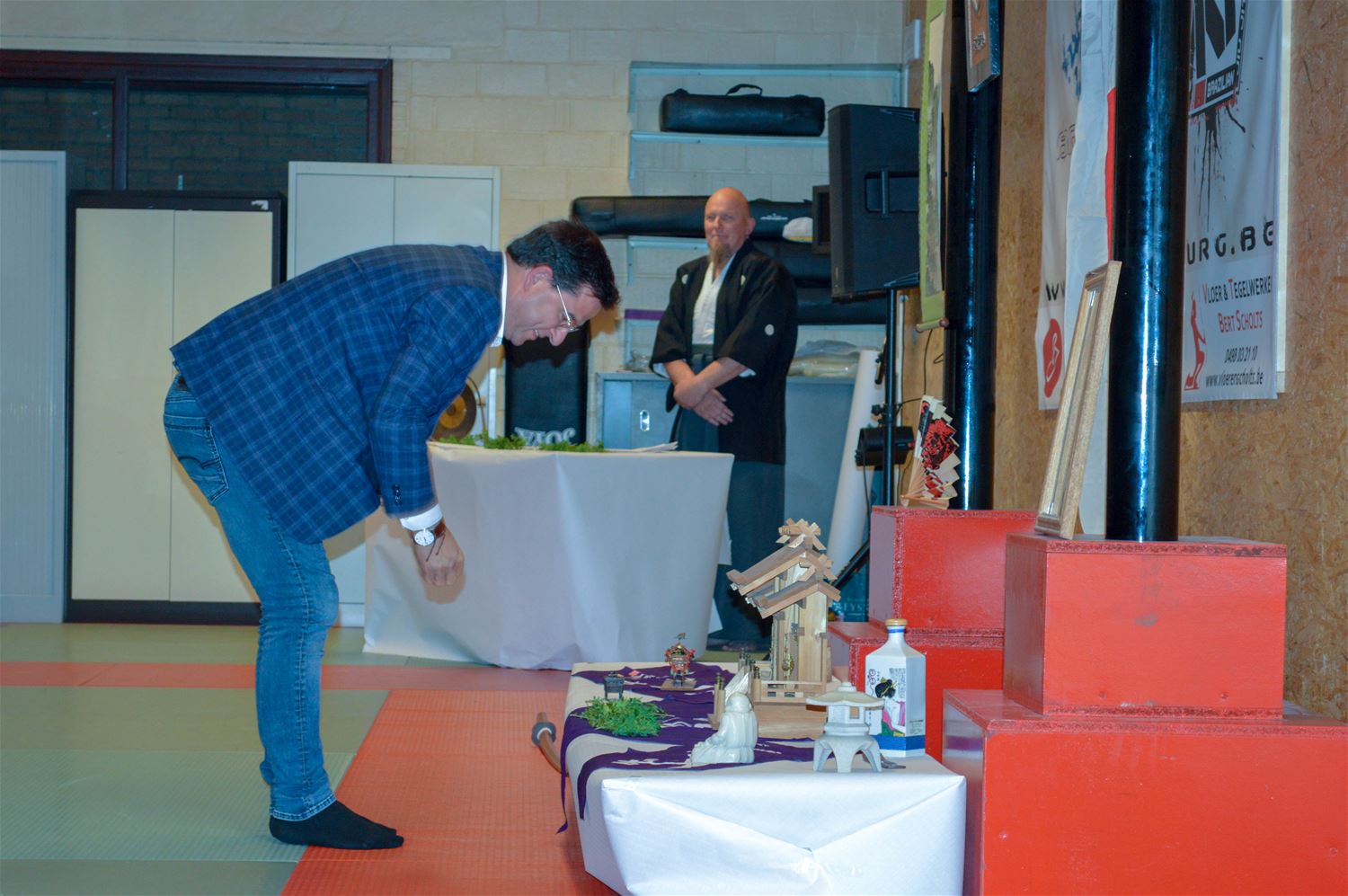 Vanavond was in het judolokaal in Zolder-Centrum veel volk samengekomen voor een speciale plechtigheid. Sigurd Munters van Bushido Jiu-Jitsu kreeg met de nodige traditionele rituelen zijn titel van Shi-Han overhandigd. Enkele weken geleden werd hij tijdens een gelijkaardige plechtigheid in Japan als grootmeester erkend. Nu konden de andere leden van de club, familie, vrienden en geïnteresseerden de uitzonderlijke plechtigheid opnieuw meemaken en tegelijk ook genieten van een aantal demonstraties. Na enkele toespraken, kreeg Sigurd zijn paarse gordel en de bijhorende oorkonde. Daarop werd geklonken, uiteraard met sake. (foto’s David Amgad)46599
