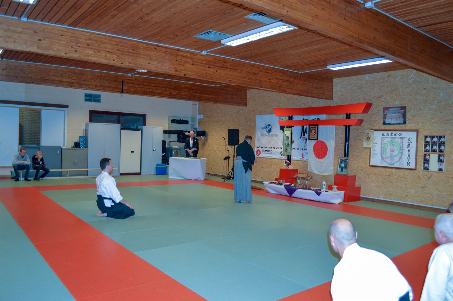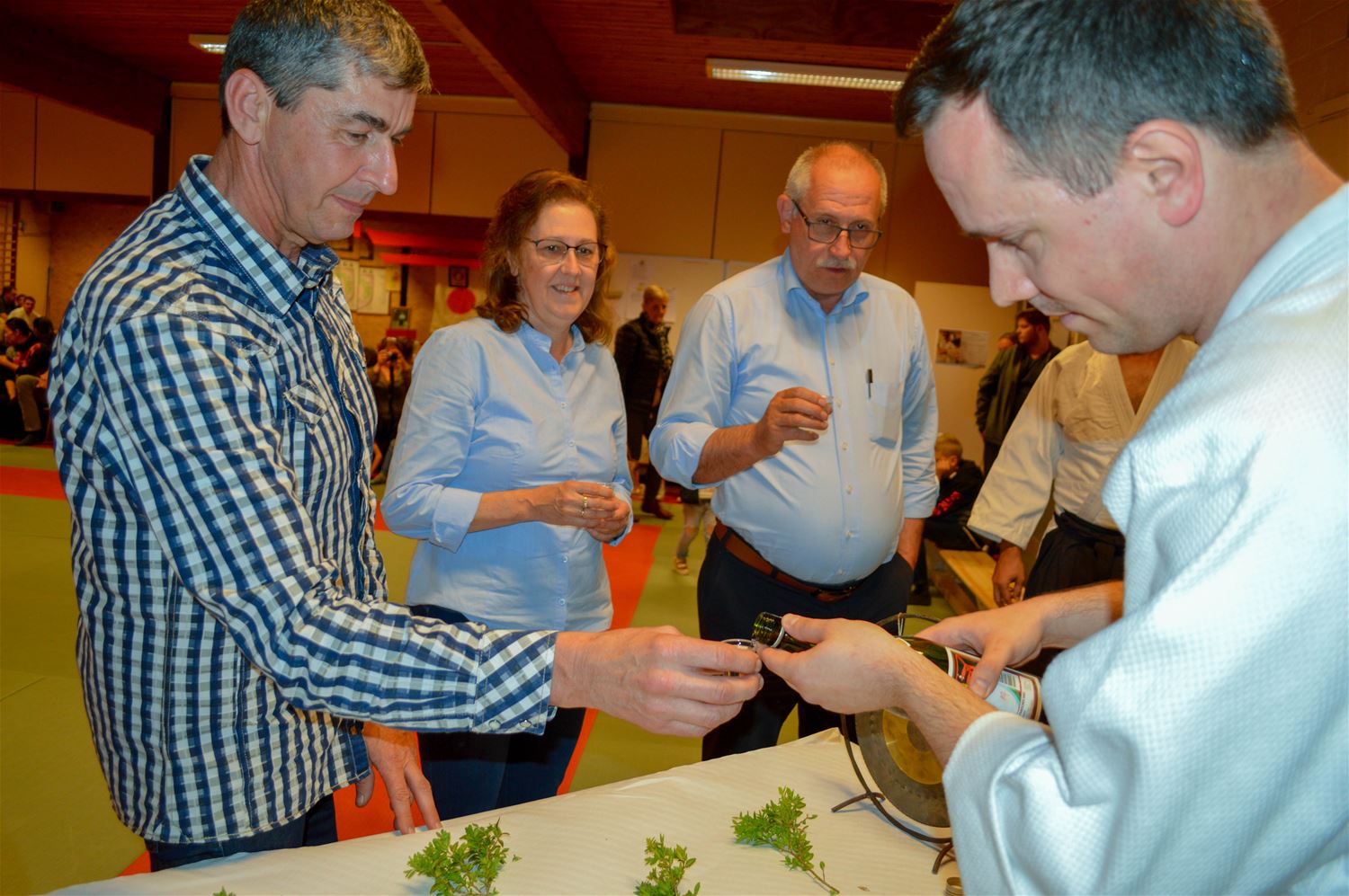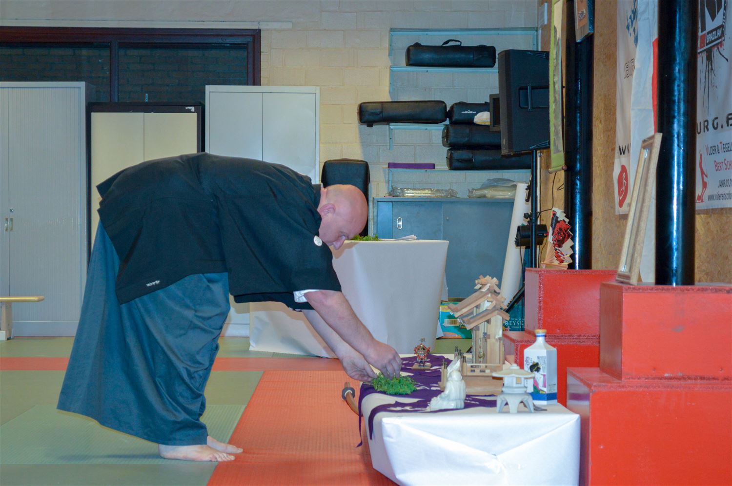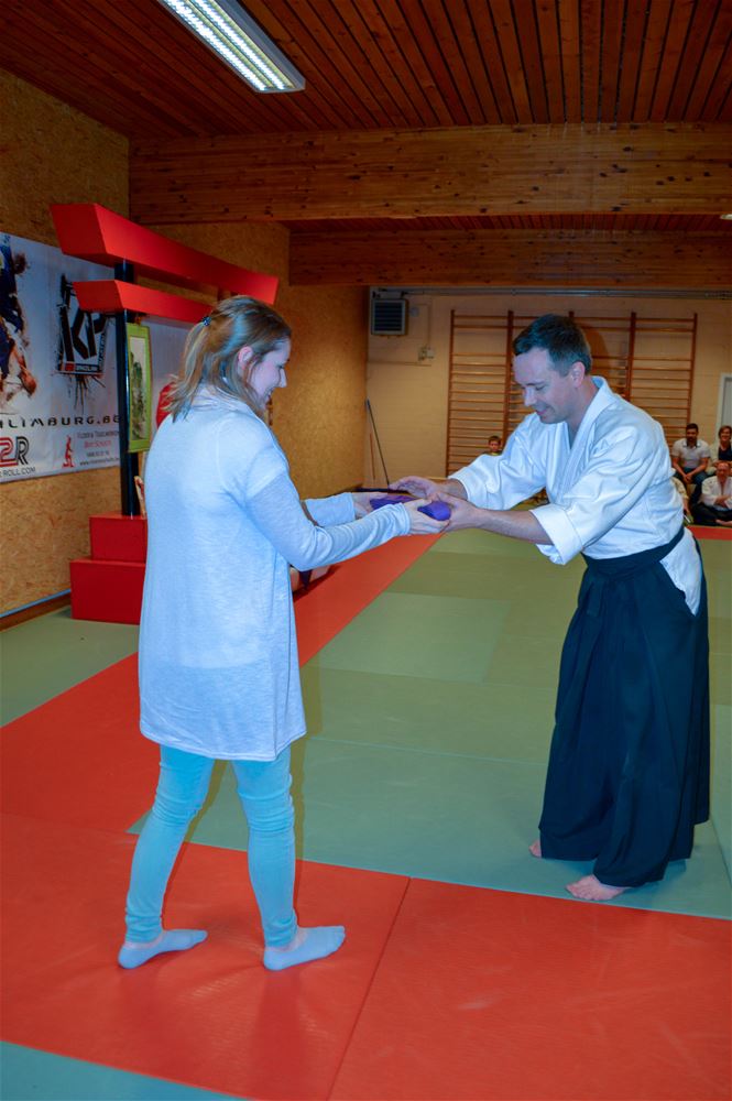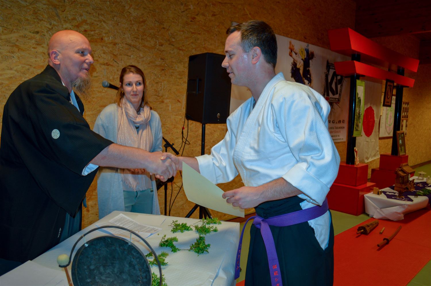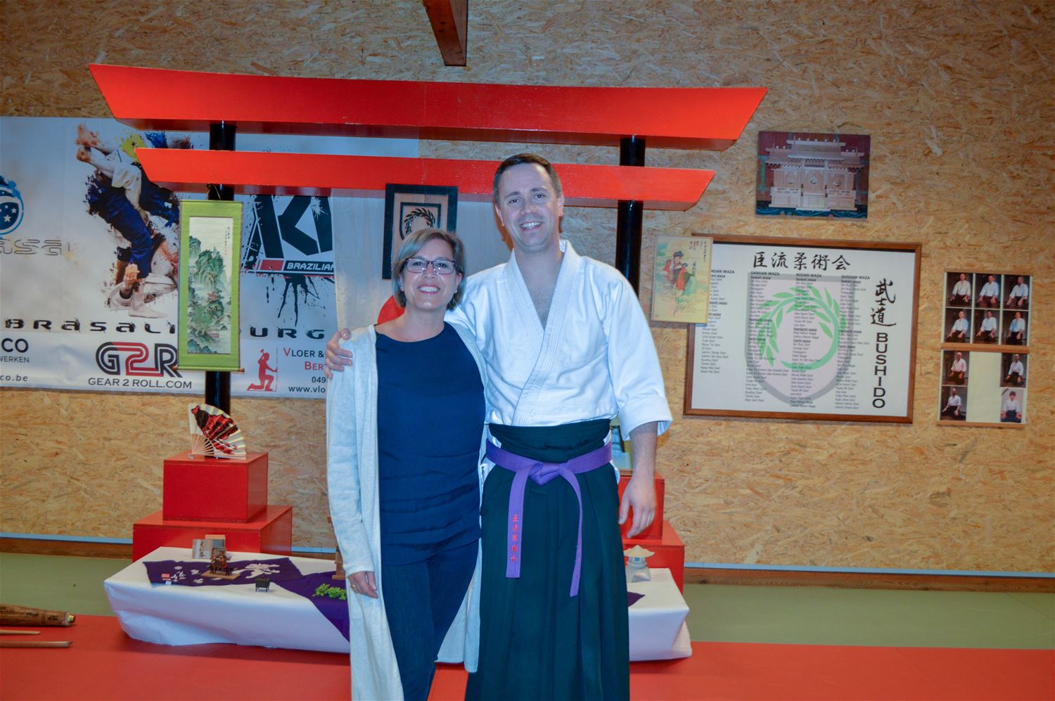 Vanavond was in het judolokaal in Zolder-Centrum veel volk samengekomen voor een speciale plechtigheid. Sigurd Munters van Bushido Jiu-Jitsu kreeg met de nodige traditionele rituelen zijn titel van Shi-Han overhandigd. Enkele weken geleden werd hij tijdens een gelijkaardige plechtigheid in Japan als grootmeester erkend. Nu konden de andere leden van de club, familie, vrienden en geïnteresseerden de uitzonderlijke plechtigheid opnieuw meemaken en tegelijk ook genieten van een aantal demonstraties. Na enkele toespraken, kreeg Sigurd zijn paarse gordel en de bijhorende oorkonde. Daarop werd geklonken, uiteraard met sake. (foto’s David Amgad)46599