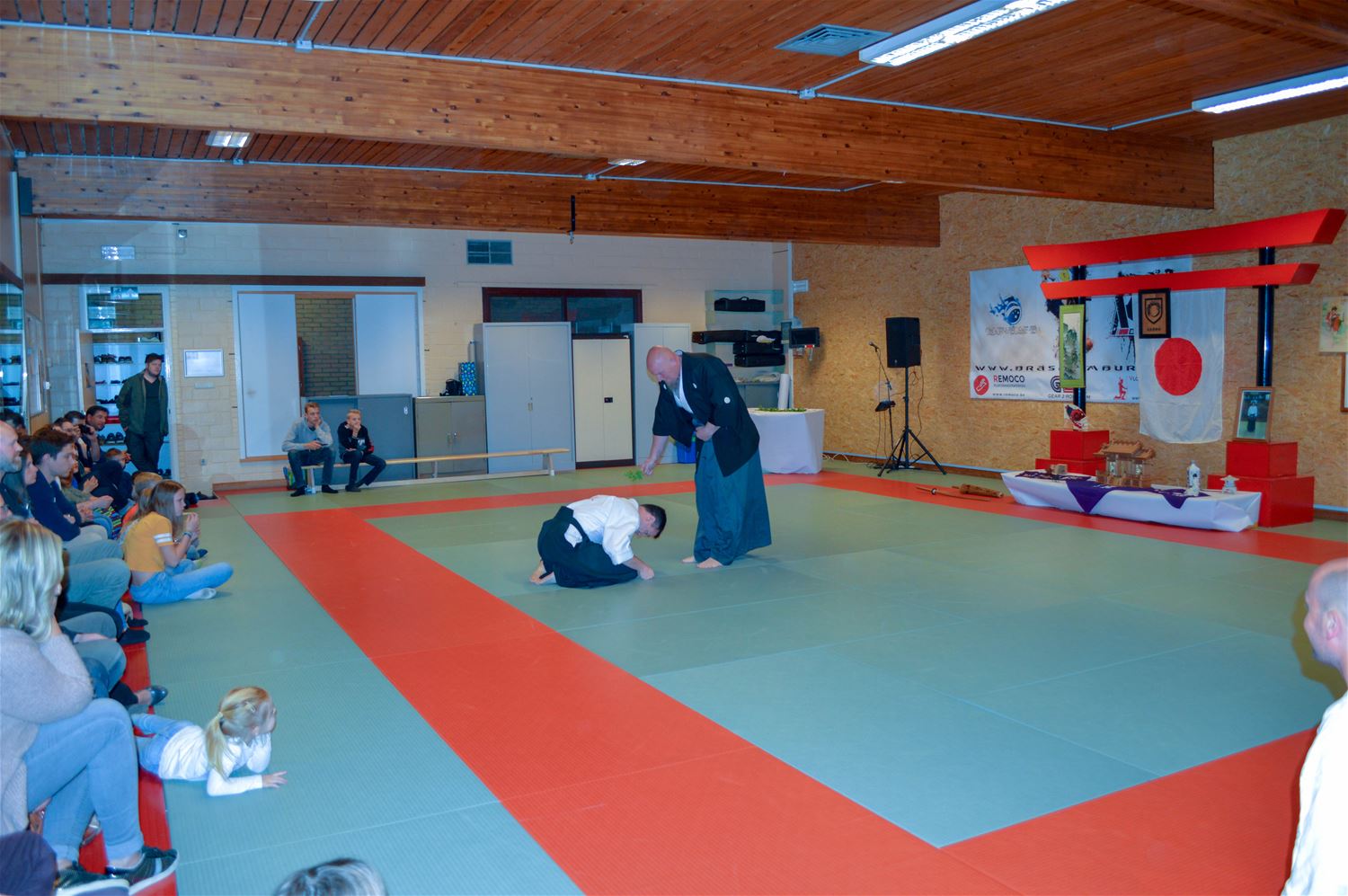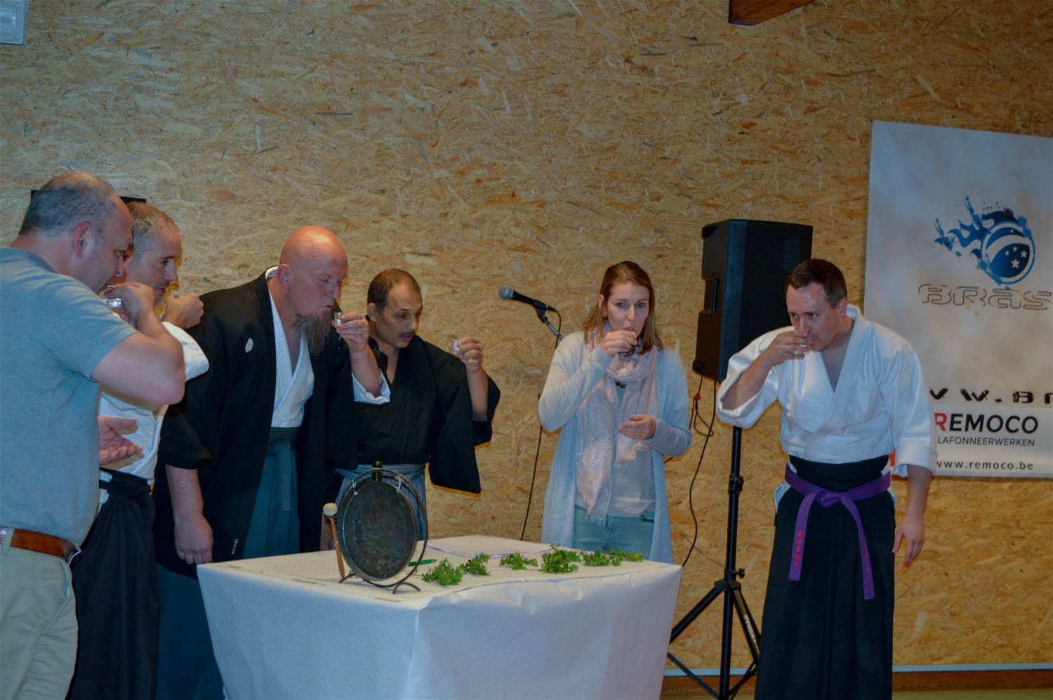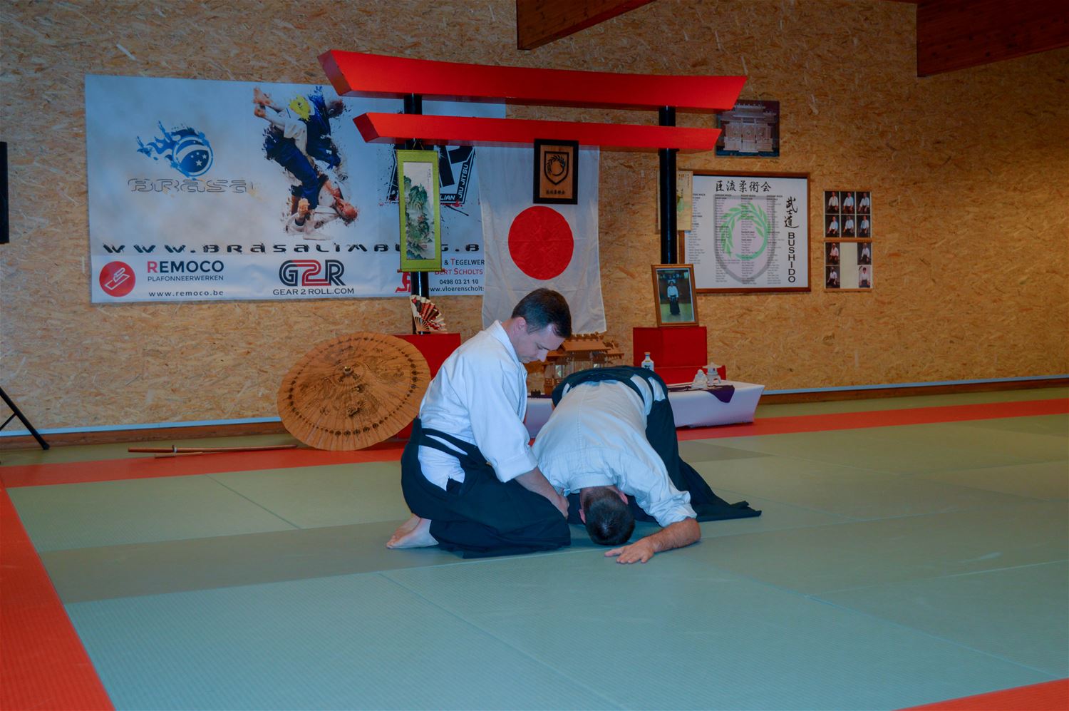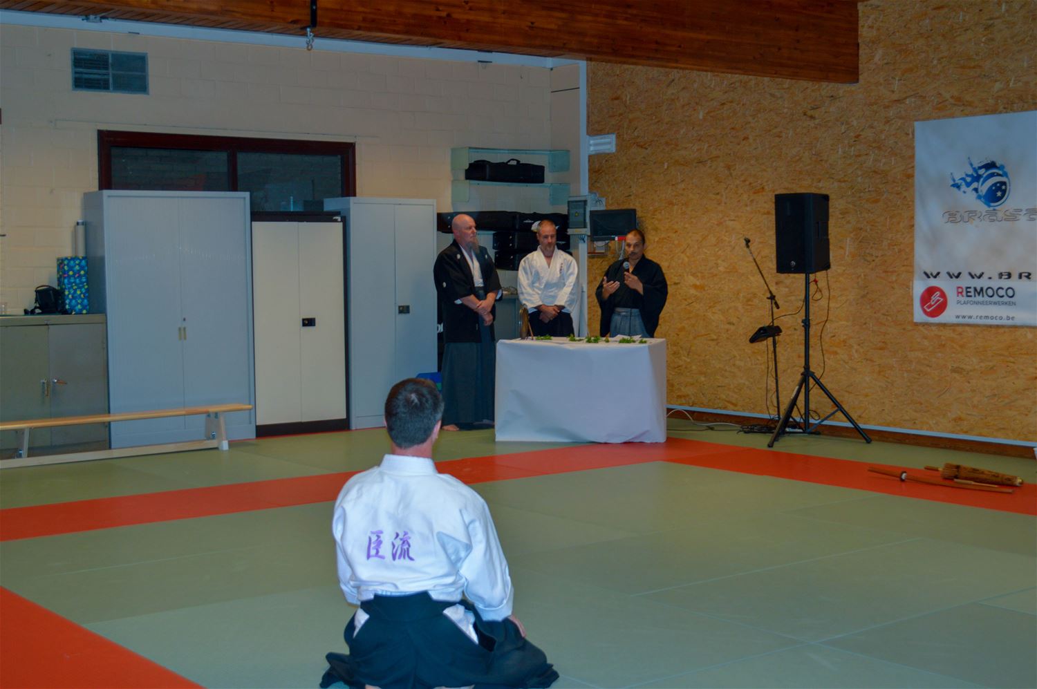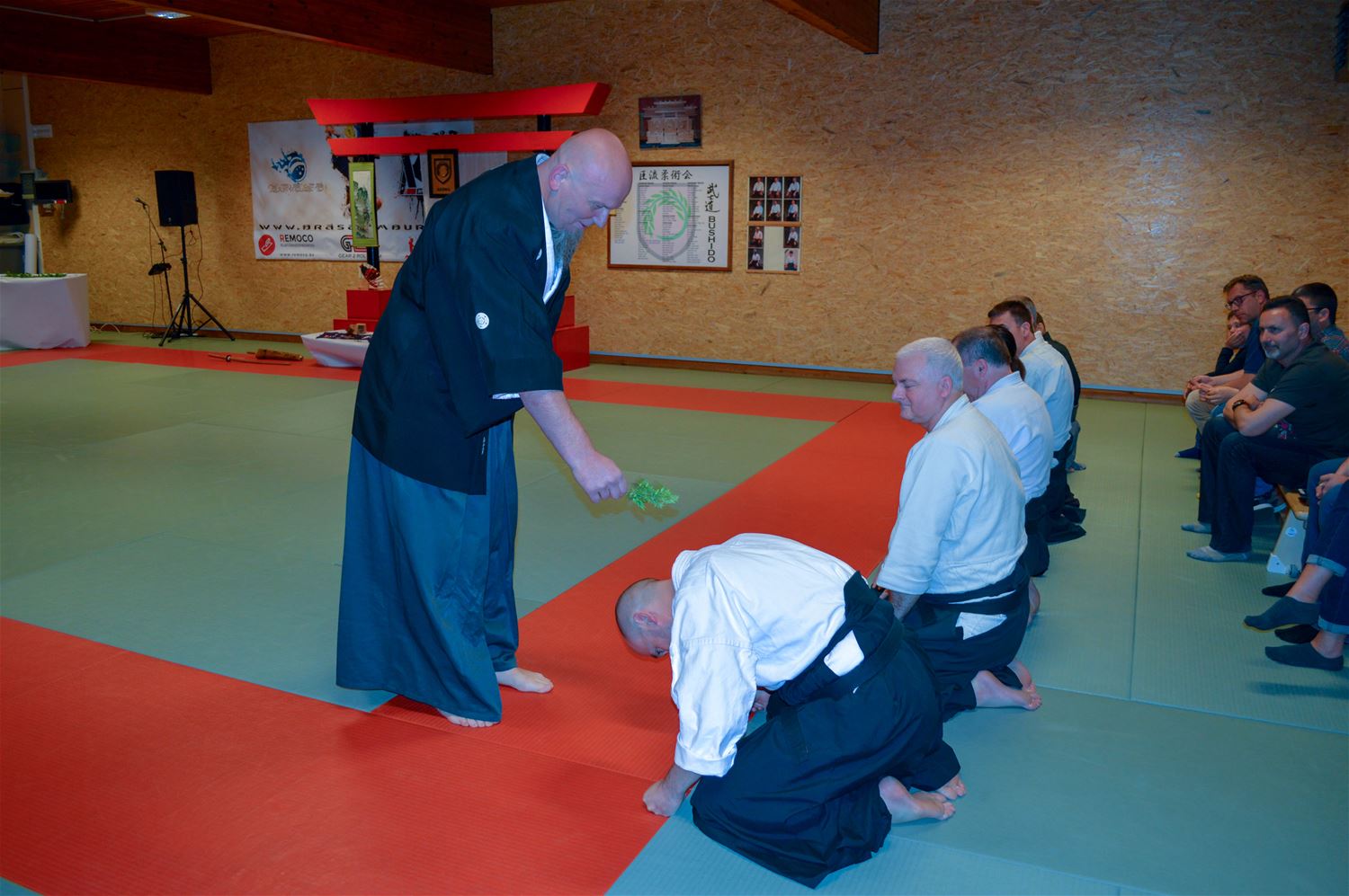 Vanavond was in het judolokaal in Zolder-Centrum veel volk samengekomen voor een speciale plechtigheid. Sigurd Munters van Bushido Jiu-Jitsu kreeg met de nodige traditionele rituelen zijn titel van Shi-Han overhandigd. Enkele weken geleden werd hij tijdens een gelijkaardige plechtigheid in Japan als grootmeester erkend. Nu konden de andere leden van de club, familie, vrienden en geïnteresseerden de uitzonderlijke plechtigheid opnieuw meemaken en tegelijk ook genieten van een aantal demonstraties. Na enkele toespraken, kreeg Sigurd zijn paarse gordel en de bijhorende oorkonde. Daarop werd geklonken, uiteraard met sake. (foto’s David Amgad)46599
