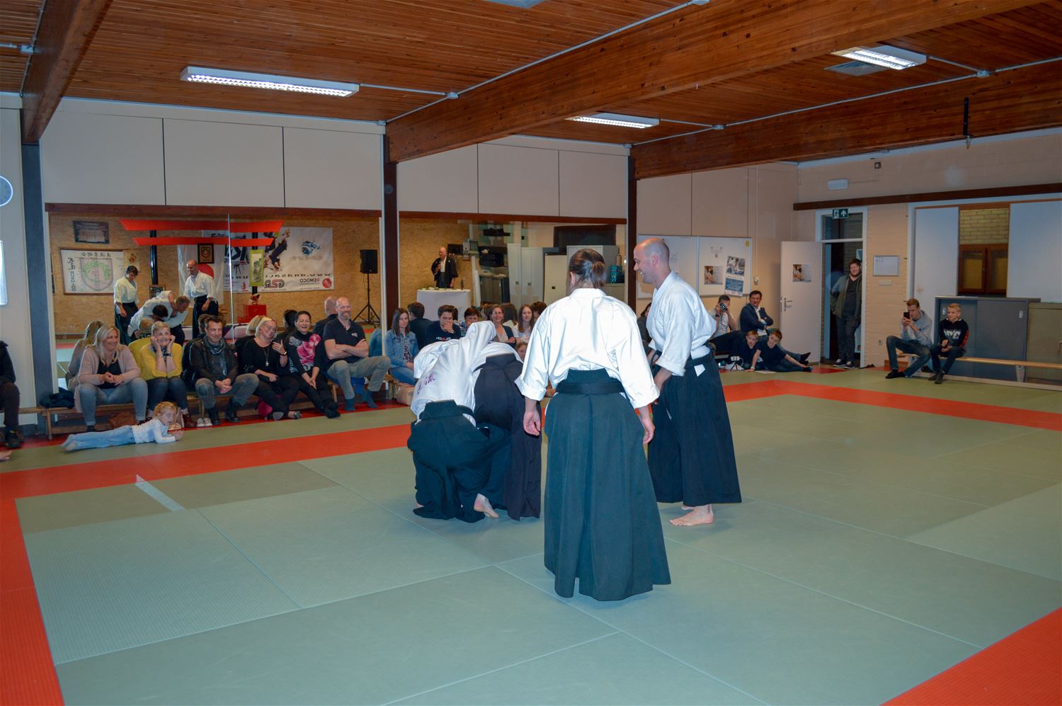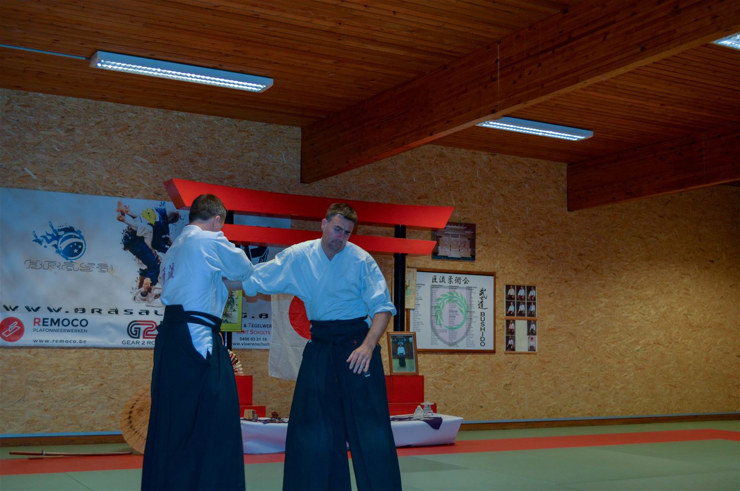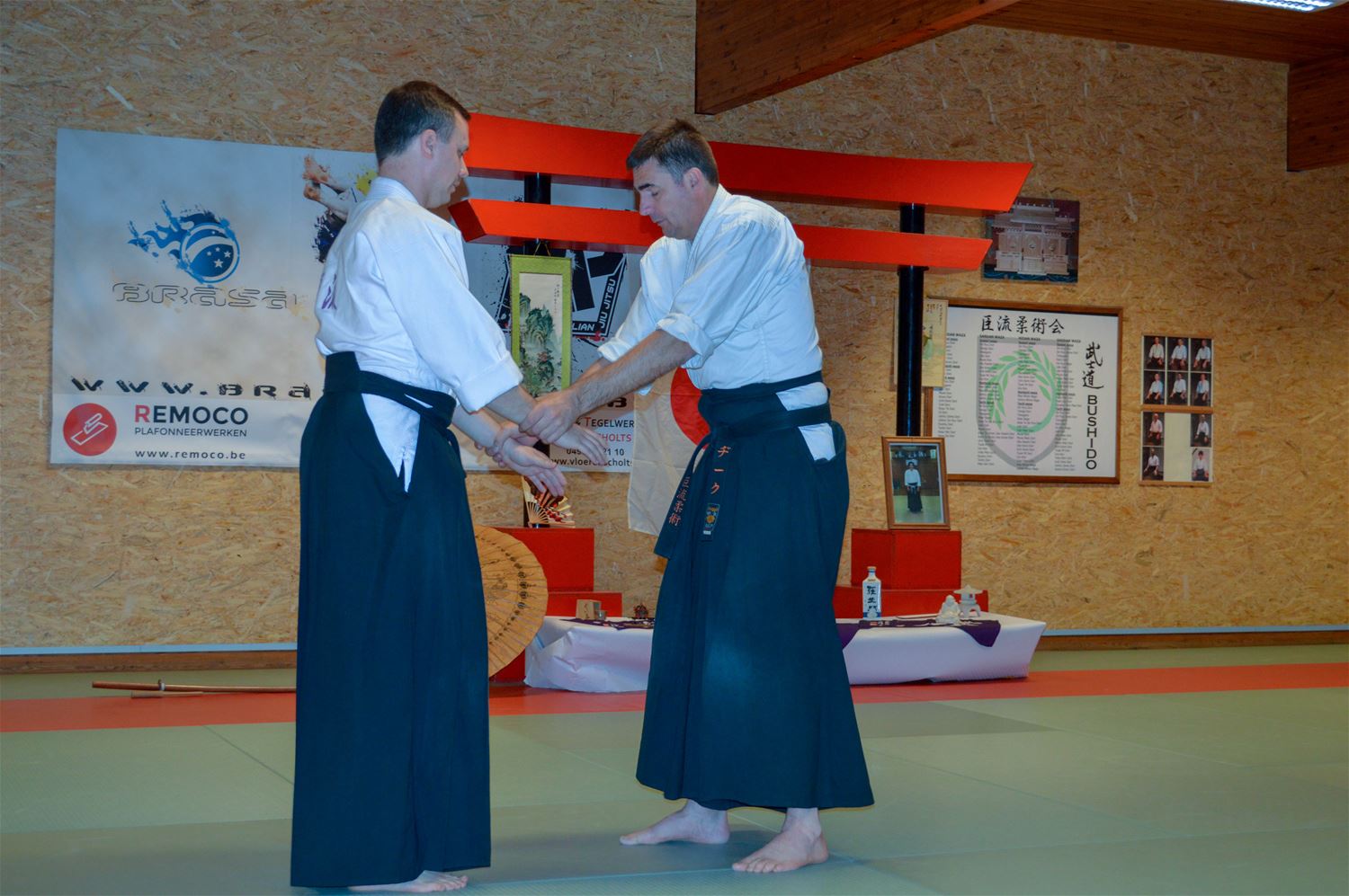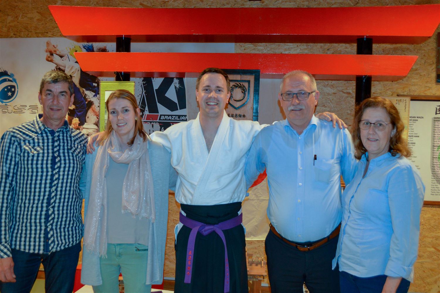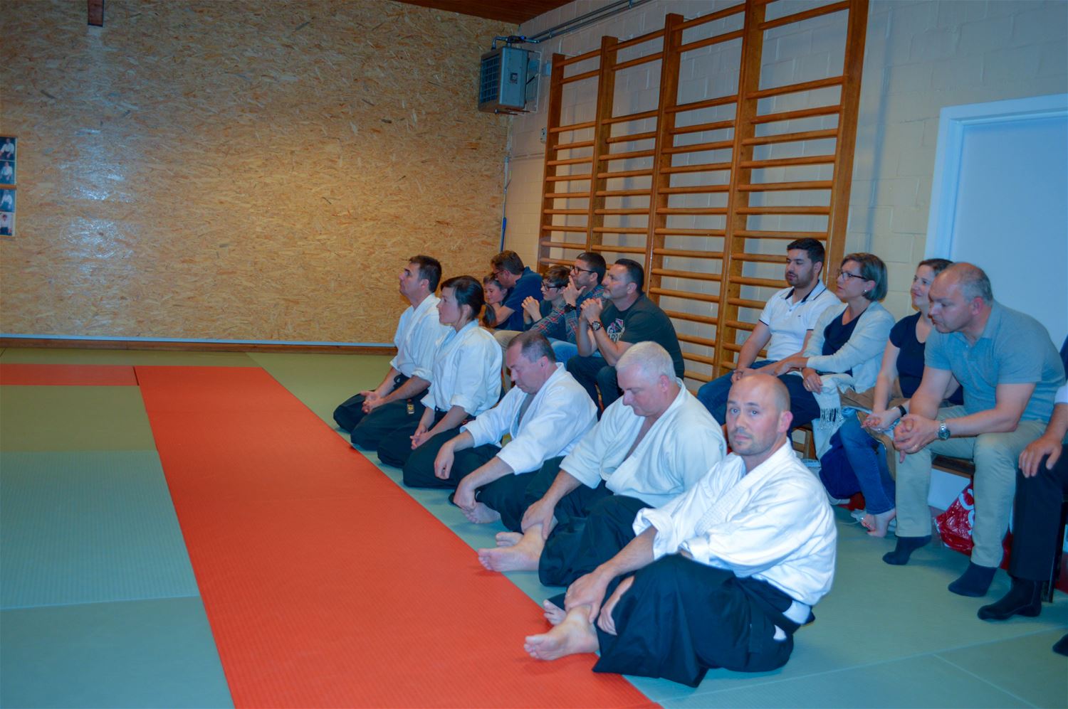 Vanavond was in het judolokaal in Zolder-Centrum veel volk samengekomen voor een speciale plechtigheid. Sigurd Munters van Bushido Jiu-Jitsu kreeg met de nodige traditionele rituelen zijn titel van Shi-Han overhandigd. Enkele weken geleden werd hij tijdens een gelijkaardige plechtigheid in Japan als grootmeester erkend. Nu konden de andere leden van de club, familie, vrienden en geïnteresseerden de uitzonderlijke plechtigheid opnieuw meemaken en tegelijk ook genieten van een aantal demonstraties. Na enkele toespraken, kreeg Sigurd zijn paarse gordel en de bijhorende oorkonde. Daarop werd geklonken, uiteraard met sake. (foto’s David Amgad)46599