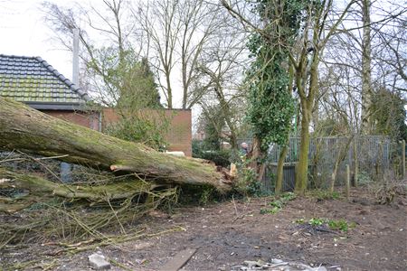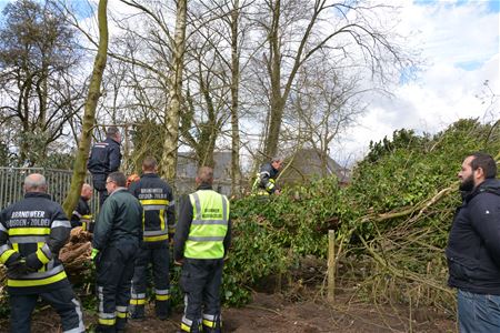 De brandweer heeft vandaag verschillende oproepen voor stormschade moeten afwerken. In de meeste gevallen moesten daarbij afgerukte takken of omgewaaide bomen opgeruimd worden. Ernstiger was de situatie in De Lobbert. Daar was een oude dikke boom omgewaaid op een achterbouw van de buren die daarbij zwaar beschadigd werd. De boom had nog een andere in zijn val meegenomen. Die moest omzichtig worden verwijderd door de brandweer om te vermijden dat die ook op het huis of op de hulpverleners terechtkwam. Er werden eerst inkepingen in de boom gezaagd en met de hulp van spanbanden werd die uiteindelijk naar beneden gehaald.20002
