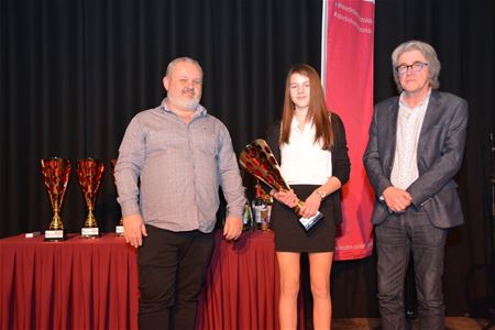 Ook dit jaar waren er weer trofeeën voor beloftevolle jongeren. Sportmeisje van het jaar werd Britte Lodewijckx van AV Toekomst. Zij werd Belgisch kampioen indoor op 60 m horden en outdoor 80 m horden, Vlaams kampioen indoor 60 m horden, outdoor 80 m horden en 200 m, provinciaal kampioen indoor verspringen en 60 m horden en 200 m en outdoor 80 m horden, 100 en 200 m en 4 x 100 m bij de kadetten. De sportjongen van het jaar kwam uit de paardensport: Cedric Nouwen van de Meylandtridders Heusden kroonde zich vorig jaar tot Limburgs en Belgisch kampioen viertal zwaar B met Heros van het Hezerhof. (foto's Marina Poelmans)39470