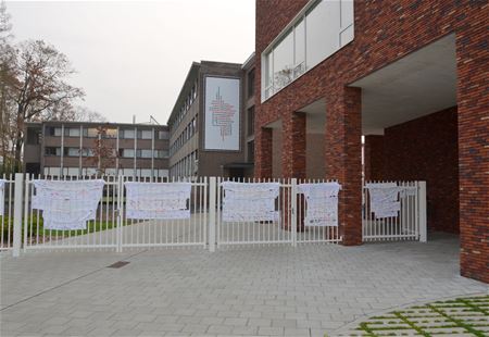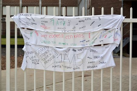 Vandaag is het Werelddag van Verzet tegen Armoede. En ook in het Sint-Franciscuscollege gaat dat niet ongemerkt voorbij. Omdat 1 kind op 4 in Heusden-Zolder opgroeit in armoede willen leerlingen en leerkrachten een signaal geven dat ze opkomen tegen armoede. De leerlingen van de eerste graad noteerden vanmorgen per klas een boodschap op een wit laken. Nadien werd dat aan de schoolpoort opgehangen. (foto's Noël Engelen)35912