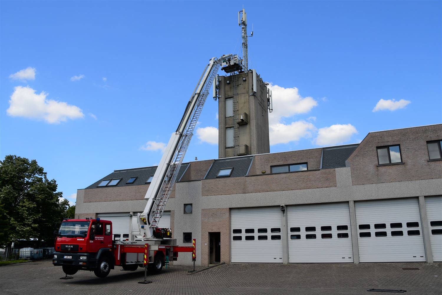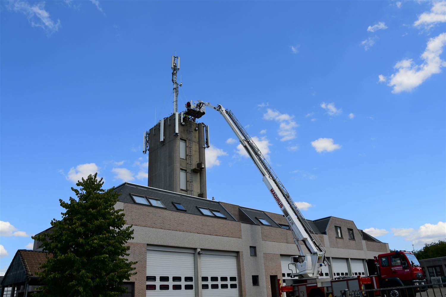 Ja, je hebt het goed gehoord: de brandweersirene heeft deze namiddag enkele keren kort geloeid. De brandweermannen hebben haar met behulp van de elevator teruggeplaatst nadat ze hersteld was en uiteraard moest ze kort getest worden. Het is nu wachten tot 11 augustus, de herdenking van de brandramp, tot ze voor het eerst officieel zal loeien en daarna weer dagelijks om 17 uur. (foto's Michiel Reynders)
