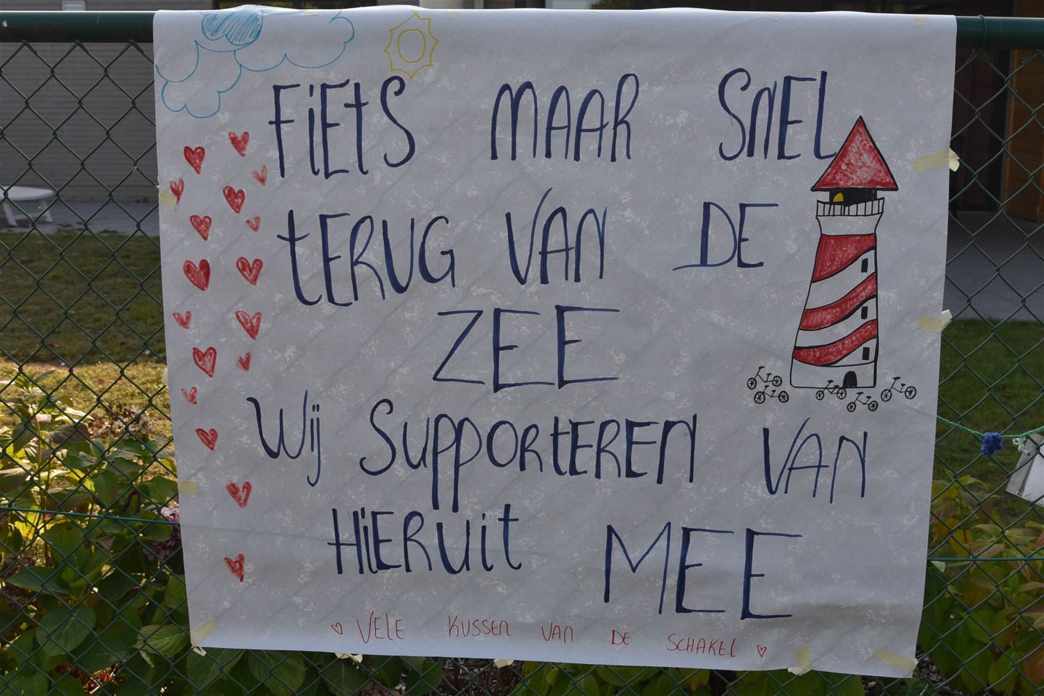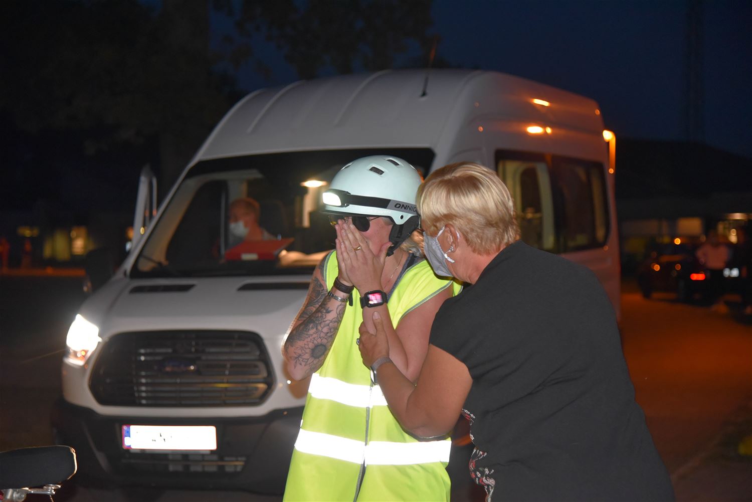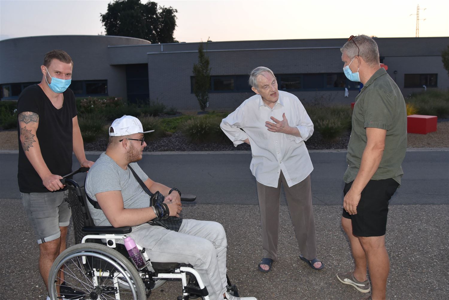 Feest aan 't Weyerke vanavond want de vier dappere fietsers hebben het gehaald. Nog voor het krieken van de ochtend waren ze met hun duofietsen vertrokken in Blankenberge. Hun odyssee onderweg werd op het thuisfront gevolgd en becommentarieerd via Radio Weyerke. De zorggebruikers, collega's en sympathisanten waren - uiteraard beperkt - opgedaagd om hen vanvond te verwelkomen te spandoeken. En na exact 198 km, 15 uur en 25 minuten fietsen kwamen Gwendoline, Saartje, Charlotte en Hanneze om 20.15 het domein opgereden, luid toegejuicht maar doodmoe. Overigens zijn sponsors nog altijd welkom om die rolstoelfiets te kunnen aankopen. (foto's David Amgad)62042