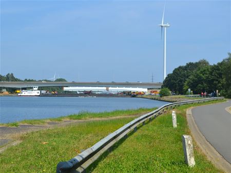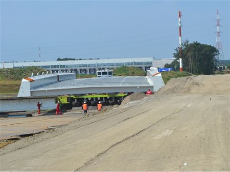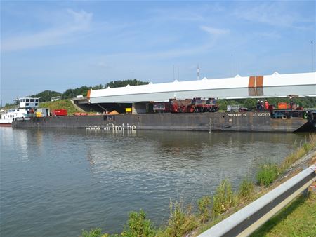 Rond het middaguur is het gelukt om de gigantische bodemplaat op de oever te krijgen en vervolgens stilaan naar de montageplek te brengen. Dat is later dan voorzien, maar op zich vormt dat geen probleem. (foto's Lode Beylemans) UPDATE Kort voor twee uur lag de plaat volledig op haar steunpilaren. Het scheepvaartverkeer kan weer normaal verlopen. Al bij al is heel de operatie zonder veel problemen verlopen.