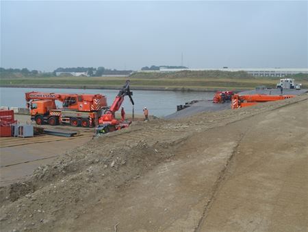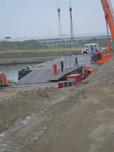 Het gaat vooruit vanochtend langs het kanaal. Het tweede deel van is omstreeks 9 uur van het ponton gehaald. Boot en ponton werden daarop zo snel mogelijk in gereedheid gebracht om te vertrekken zodat het kanaal volledig kon vrijgegeven worden. Ondertussen worden beide brugonderdelen naast elkaar én waterpas gelegd. Twee mastodonten en toch worden ze heel precies op elkaar afgesteld. Specialistenwerk! (foto's Lode Beylemans)28086
