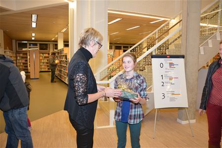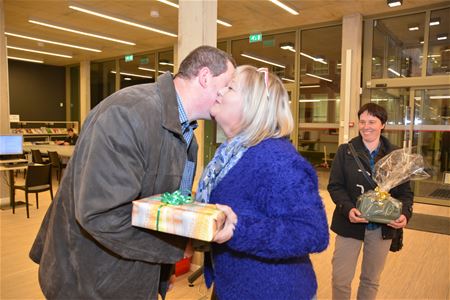 In de bibliotheek heeft schepen van cultuur Marleen Hoydonckx vanavond de prijzen uitgereikt van de zoektocht van het openingsfeest van de nieuwe bib. Toen moesten de bezoekers een aantal opdrachten uitvoeren en als schiftingsvraag het aantal ontleningen vorig jaar opgeven. Het bleken er 391.958 te zijn. De hoofdprijs - een tablet - werd weggekaapt door Benny Ceyssens. De tweede prijs was voor Veerle Neven en de derde voor Winke Warson, zij kregen elk een boekenpakket.
