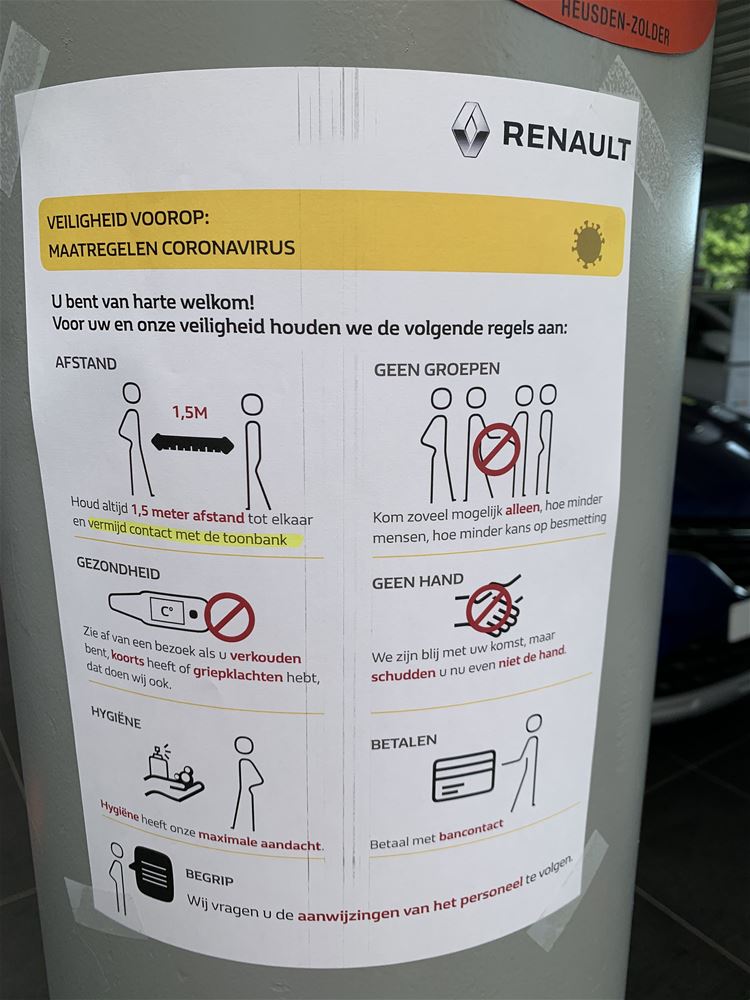 Elke zaak heeft uiteraard haar specifieke vereisten. Zo zijn bij Garage Kwanten in de Guido Gezellelaan verschillende draaiboeken opgemaakt. Elke afdeling - receptie, verkoop en werkplaats - heeft haar eigen specifieke en zeer strikte richtlijnen en dan zijn er nog algenene richtlijnen. Bij herstellingen bijvoorbeeld worden beschermhoezen aangebracht, delen wordt gedesinfecteerd, ... Elke mecanieker heeft zijn werkplek en gereedschapskist, ... Ook aan de klanten wordt gevraagd om de handen te desinfecteren - alles is ter plaatse voorzien daarvoor - afstand te bewaren op de bollen, zoveel mogelijk alleen te komen, er staan plexischermen op de balies en bij de verkopers, ...53820
