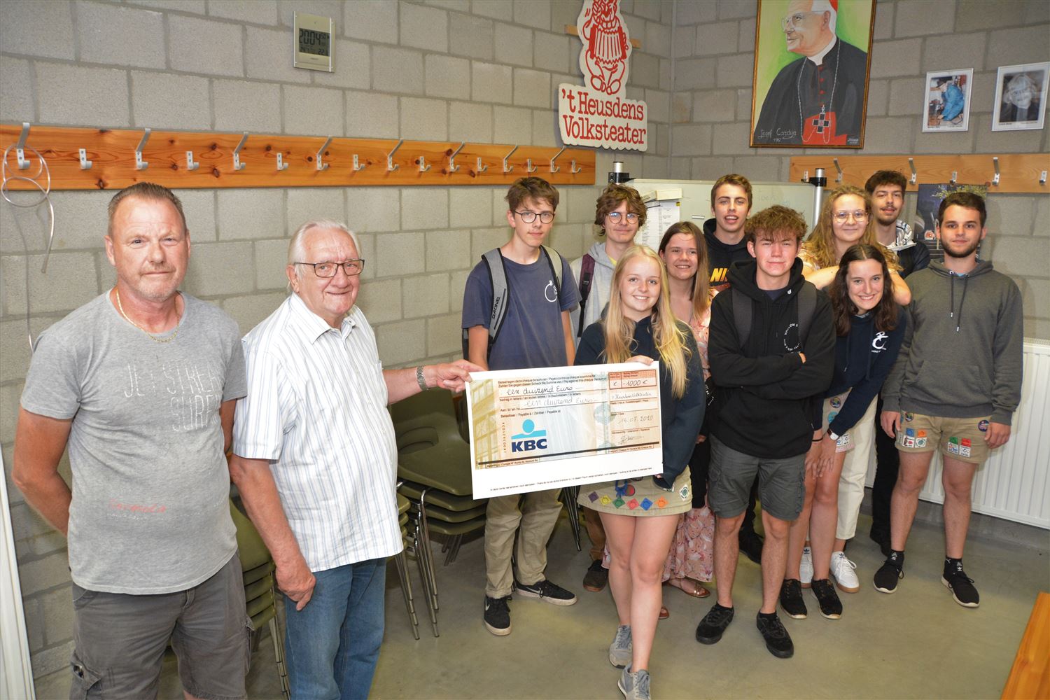 Voorzitter Raymond Claes en bestuurslid Danny Haesevoets van 't Heusdens Volksteater konden vanavond een cheque van 1.000 euro overhandigen aan Chiro Heusden. Bij de revuevoorstellingen komen Chiroleden telkens een handje toesteken in de vestiaire. Ze krijgen nadien de opbrengst, die 't HVT dan nog naar boven afrondt. Voor de Chiro komt het geld goed van pas. Enerzijds moeten er nog wat verfraaiingswerken gebeuren aan hun terrein in de Schomstraat. Anderzijds kan met het geld materiaal voor het bivak aangekocht worden. Dat bivak vindt de komende weken in Retie plaats, en ze gaan in drie bubbels in drie opeenvolgende periodes.59408
