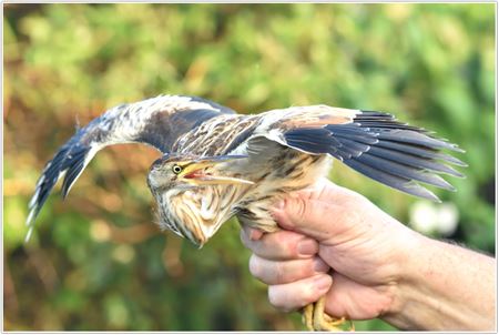 Ook dezer dagen hebben vogelliefhebbers weer volop trekvogels geringd. En ook nu werd het weer een bijzondere vangst want er belandde een woudaapje in de netten. Door zijn beperkte omvang kan deze kleinste reigersoort behendig tussen het riet door klauteren, waarbij de lange tenen vaak meerdere rietstengels tegelijk vastnemen De vogel bleef rustig poseren op de arm van Lode Was. Met een identificatiering mocht de 'aap' terug de vrije natuur in. (foto Stefan Was)22513