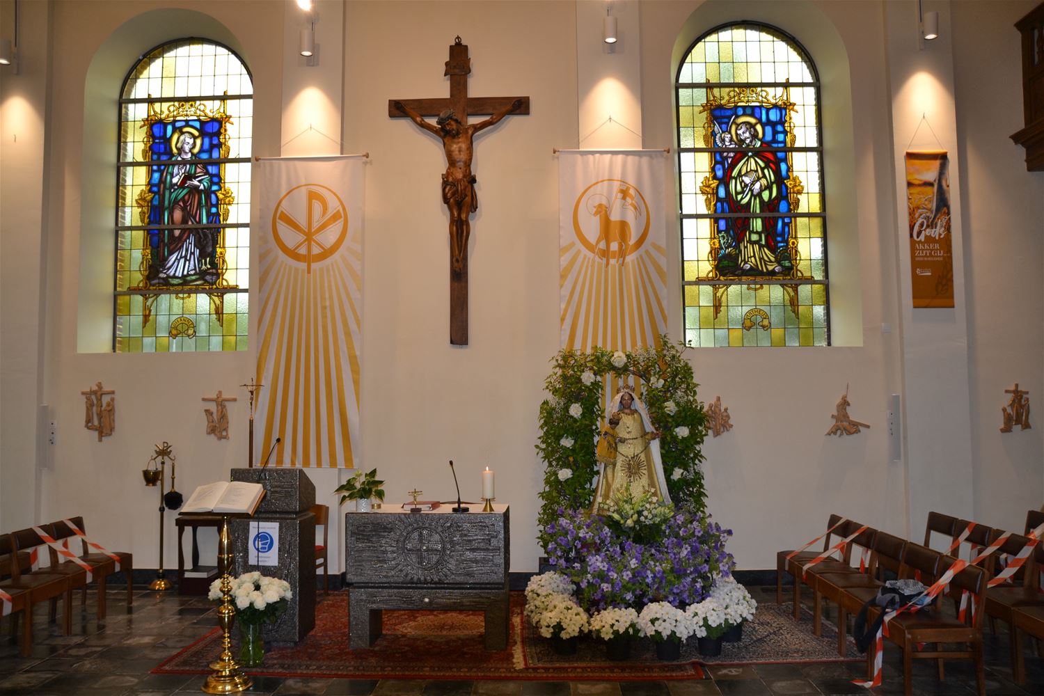 Vanavond stond in de kerk van Viversel de eucharistieviering in het teken van O.L.V. Hemelvaart en van de wijding van het Heilig Sacrament. Daarvoor was gekozen omdat de Sacramentsprocessie op 15 augustus niet kan doorgaan omwille van de coronarichtlijnen. Zoals gemeld zal die dag de Sint-Quirinuskerk wel van 10 tot 12 uur openstaan voor een gebed of om een kaarsje te branden. De Sacramentskapel kan op 15 augustus bereikt worden via de tunnel van het circuit in de Kerkstraat. (foto's Lode Beylemans)60656