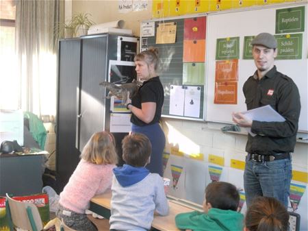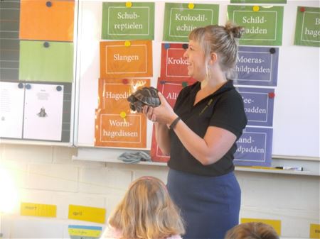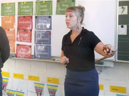 De kinderen van het tweede en het derde leerjaar van De Springplank Eversel kregen vandaag bezoek van twee medewerkers van de Olmense Zoo. en die hadden enkele bijzondere dieren bij: een koningspython, een rattenslang, een baardagaam, een luipaardgekko en een Griekse landschildpad. De kinderen waren zeer onder de indruk van de dieren, ze kregen deskundige uitleg over de kenmerken, de levenswijze en de voeding van de dieren.22821