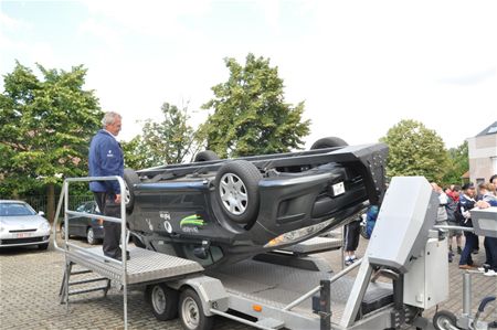 De tuimelwagen van de federale politie staat dezer dagen weer op verschillende locaties in Heusden-Zolder. Motorrijders van de lokale politie halen automobilisten die geen gordel dragen naar de kant. Dan kunnen ze een boete ontlopen door in de tuimelwagen plaats te nemen en aan den lijve te ondervinden welke risico's ze lopen indien ze zonder gordel een ongeval krijgen. Vanmorgen stond de tuimelwagen aan de brandweer, en voor een passerende jeugdbeweging was het meteen een extra attractie. Voor de 15-tal bestuurders die deze morgen alleen al aan de kant moesten, was de amusementswaarde wellicht minder.10997