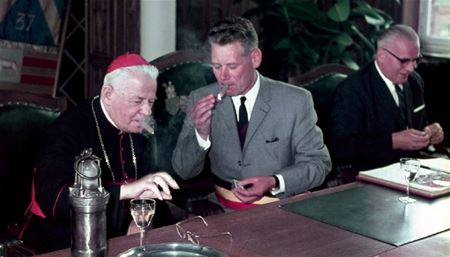 Vandaag en de komende dagen zetten we het jaarboek en de tentoonstelling van de Geschied- en Heemkundige Kring Heusden in de kijker. Het eerste onderwerp daarin is het bezoek van de legendarische kardinaal Cardijn aan Heusden op 11 juni 1967. Dat was naar aanleiding van de viering van 35 jaar KAJ, 25 jaar KWB, 20 jaar KAV en 10 jaar VKAJ. De kardinaal werd verwelkomd door burgemeester Jef Aerts, de notabelen van gemeente en kerk maar ook minister Fred Bertrand. Opvallend is ook een tafereel waarin de burgemeester, samen met de kardinaal en de minister in de raadszaal een dikke sigaar opsteken. Destijds was dat een heel normale zaak om iemand te verwelkomen.37032