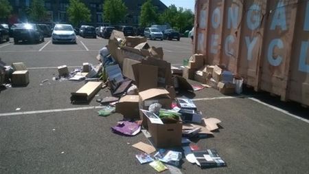 Toen de papiercontainers werden opgehaald, bleef nog een hele stapel gedropt papier achter op het Koning Boudewijnplein. Maandagavond lag er nog altijd een grote stapel. Ondertussen blijkt dat ook in de Sint-Jansblok papier is blijven staan bij de ophaling. (foto Julien Maebe)