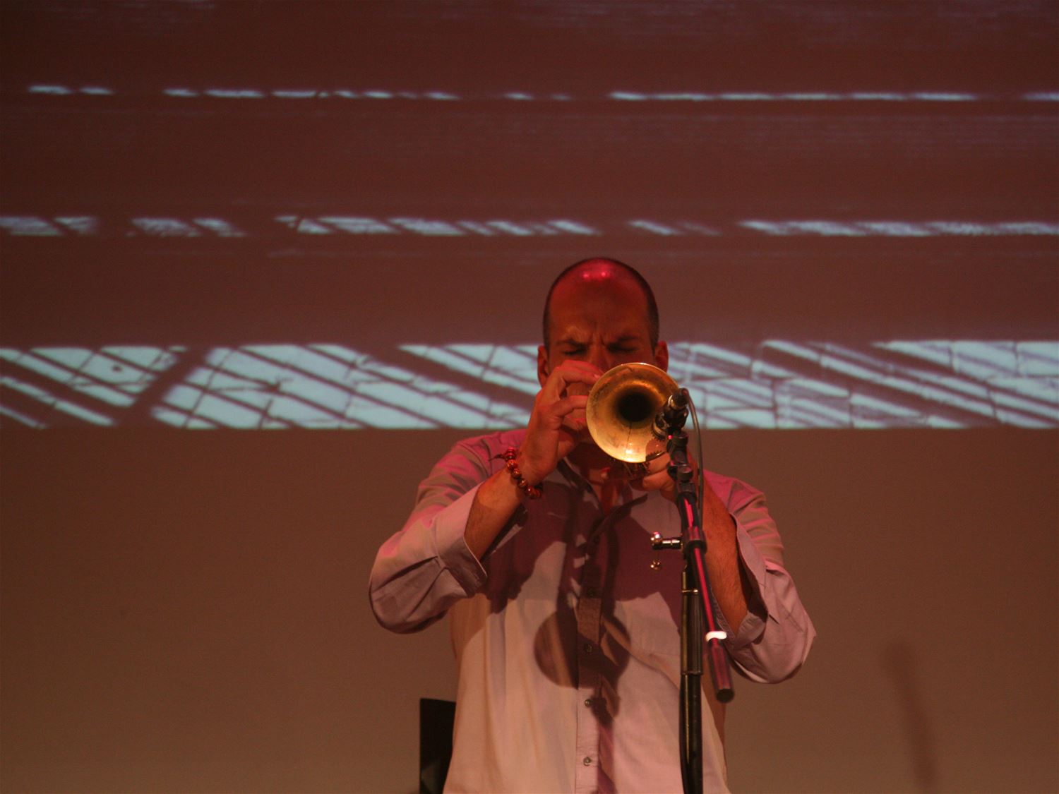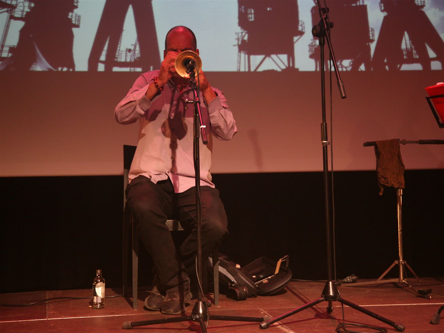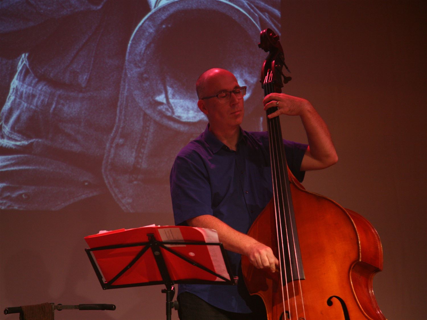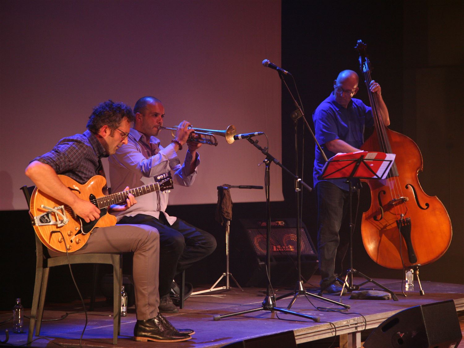Het is deze maand een eeuw geleden dat icoon Charlie Parker is geboren en dus bracht het nagelnieuwe trio Triology vanavond een muzikale hulde CC Muze. Dat gebeurde in de balzaal in een setting waarin het publiek letterlijk een pak ademruimte had, en dat kwam goed van pas bij die spetterende muziek. Voor Triology was dit ook de voorstelling van de CD 'Par Coeur'. Tijdens het optreden werden grafisch werk en foto's geprojecteerd van drummer Luc Vanden Bosch, ontwerper van de albumhoes. (foto boven Ann Jordens, foto's onder Herman Eerdekens)