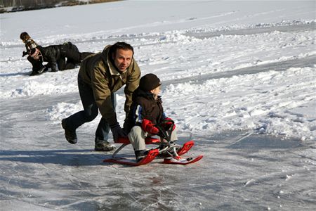 Hoewel het vrijdag bij het gemeentebestuur nog klonk dat het niet mocht, hebben honderden kinderen, jongeren en volwassenen vandaag van ijspret genoten op de vijvers van Terlaemen. Er werden bitsige ijshockeywedstrijden gespeeld, waarbij menige 'blauwe plek' is opgelopen, maar er waren ook rustiger sledetochten en andere glijpartijen. (meer foto's van Yves Maex) 9723