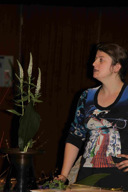 Vandaag is dus het 'Japan-project' van start gegaan in Muze. Zowat heel het cultuurcentrum ademt de sfeer van het Land van de Rijzende Zon. Zo was er vanavond een workshop ikebana; Letterlijk betekent dat 'levende bloemen' en het is de Japanse kunst van het bloemstukken maken. In tegenstelling met het bloemschikken dat bij ons gekend is, staat de kwaliteit van de bloemen voorop, waarbij gewerkt wordt aan fraaie composities met aandacht voor het lijnenspel, ritme en kleur. (foto's Ria De Clerck) 9872