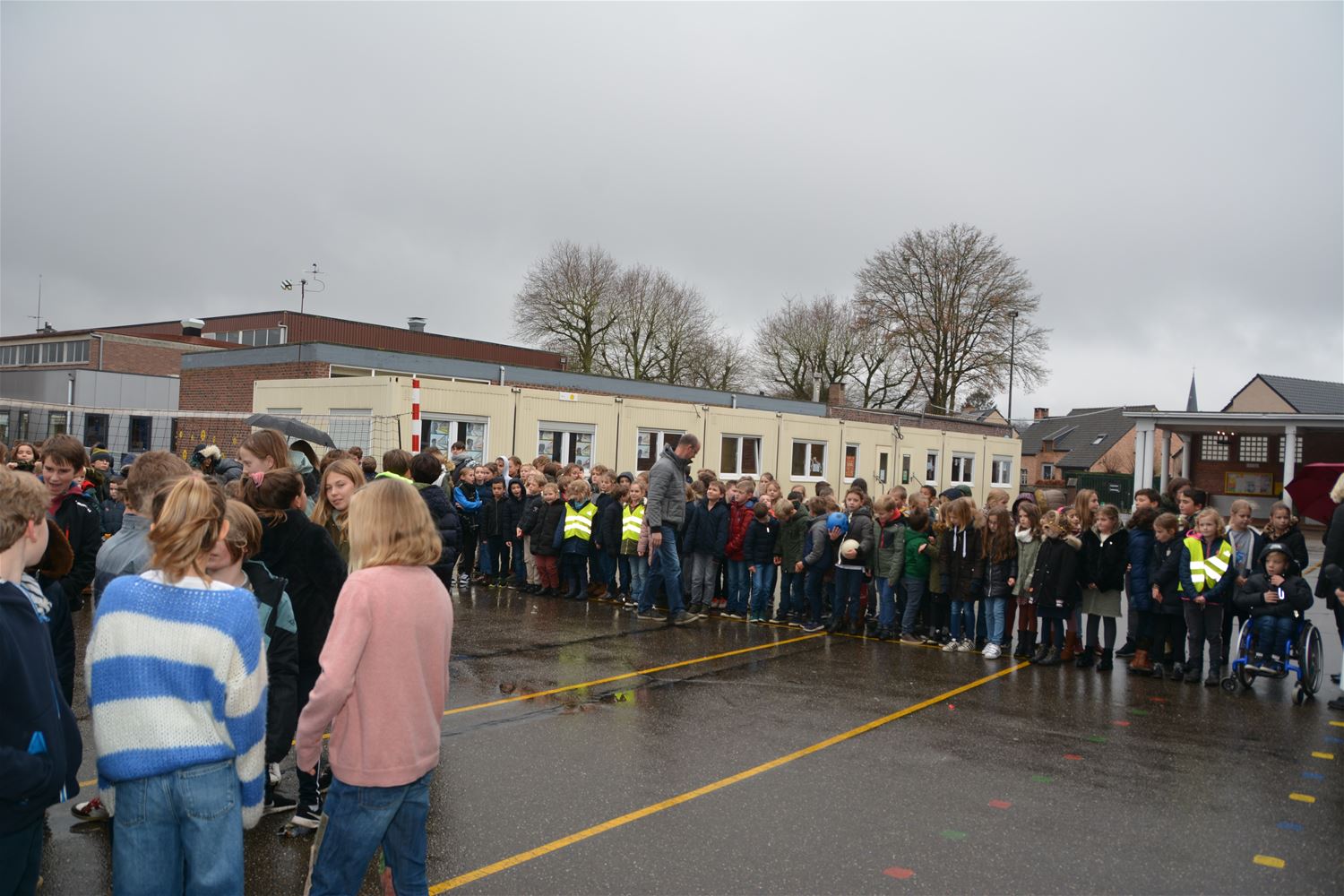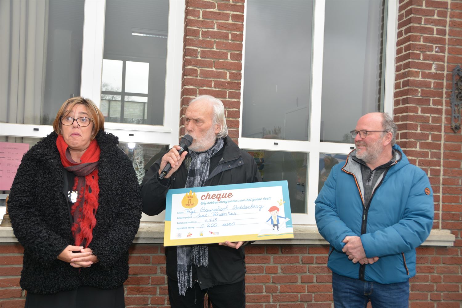 Het was slecht weer vanmiddag en toch hing er een hartverwarmende sfeer op de speelplaats van de Vrije Basisschool in Bolderberg. In aanwezigheid van alle leerlingen mocht directrice Annette Palmers een cheque overhandigen aan voorzitter Jef Aerts en ondervoorzitter Stefan Was van Sint-Vincentius. En wat voor een cheque: liefst 2.200 euro. Het was de opbrengst van de actie 'Lees je warm'. De kinderen mochten boeken lezen en de ouders konden die sponsoren. Er werden liefst 6.745 titels veroberd. Van een belezen school gesproken! En de delegatie van Sint-Vincentius was in de wolken met zo'n opbrengst. Binnenkort mogen de leerlingen op bezoek bij Sint-Vincentius. (foto's Marina Poelmans)50078