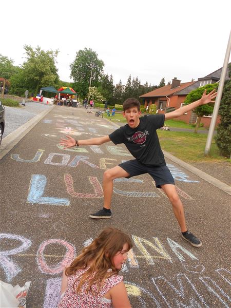 De inwoners van Halhei organiseerden hun straatfeest. Ze startten al in de namiddag zodat ook de kinderen konden spelen, en dat deden die voluit op het springkasteel, met stoepkrijten, fietsen en steppen op straat en er was de altijd populaire schminkstand. Dan schoof iedereen aan voor de barbecue, waarna nog lang werd door gefeest en gekletst. (foto's Sara Bellinkx)27358