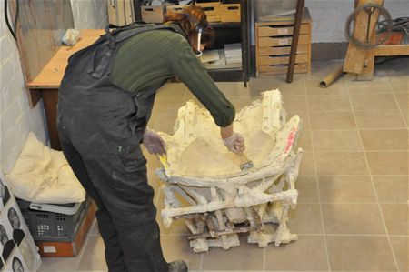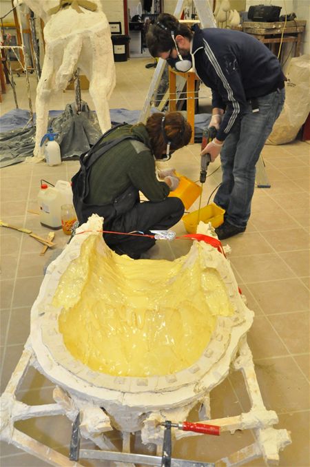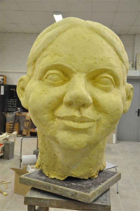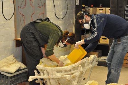 In het atelier beeldhouwen van de academie voor beeldende kunsten is vandaag het hoofd van reus Jef Slam gegoten. Onder leiding van Veerle Achten werd bijzonder secuur te werk gegaan. Eerst werd in de twee mallen een laag aangebracht, vervolgens werden die tegen elkaar geplaatst en afgewerkt. Helemaal wordt het hoofd niet gevuld, want dan zou de reus veel te zwaar en te moeilijk hanteerbaar worden. Alles gebeurde onder het toeziend oog van zijn ega Trees Turf die al eerder gemaakt was. Kan het nog romantischer dan dat het Heusdens reuzenkoppel op Valentijn uitzicht krijgt op zijn reünie? Over een week mag Jef tevoorschijn komen