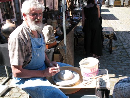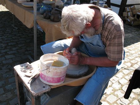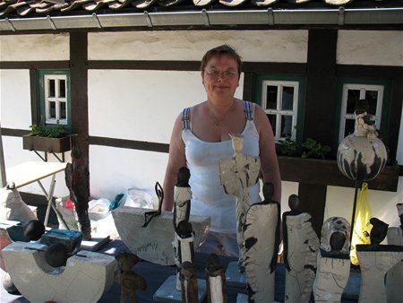 Op de binnenkoer van domein Bovy kan je kennismaken met het werk van een 17-tal keramiekkunstenaars. Onder hen ook twee dorpsgenoten, Joseph Steenberghs en Christiane Hamblok die ter plekke aan de slag zijn. Joseph is volop potten aan het draaien - zijn persoonlijk record is 49 cm hoog - maar hij puft, want de warmte en de wind zorgen ervoor dat de klei snel droogt. Even verder heeft Christiane het nog warmer want zij stookt de oven volgens de Japanse raku-techniek tot 920 graden Celsius om figuren te bakken. Ondertussen toont ze haar kleurrijke creaties. Ook nog te bezoeken zondag en maandag van 10 tot 18 uur