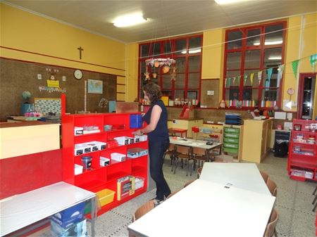 Directeur Ludo Vanende was er vanmorgen vroeg bij om de poort van lagere school De Brug te openen. Hij verwachtte 290 leerlingen. Even later ging juffrouw Deborah aan de slag om de laatste hand te leggen aan haar kleuterklasje. Daar verwachtte ze 22 5-jarigen. (foto's Julien Maebe) 22533