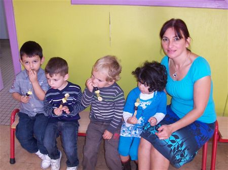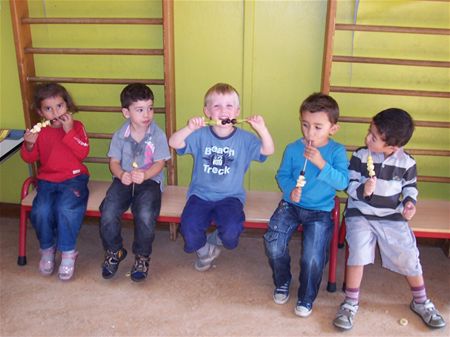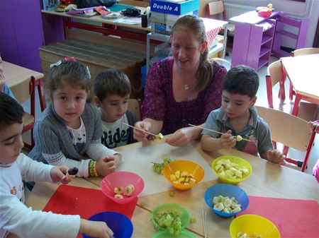 De kleuters van BSGO Het Bergske in Zolder-Centrum leren deze week over gezond fruit en ze maken zelf lekkere fruitsatés. De kleuters mochten onder leiding van de juffen Laura, Sevim en Belinda fruit in stukjes snijden en op een stokje prikken. Met als finale het oppeuzelen natuurlijk.8651