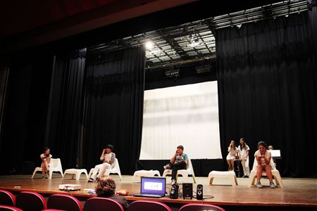 Kunstverkenner Junior repeteert vandaag in cultuurcentrum Muze voor de voorstelling 'In gesprek', die wordt op zondag 10 mei om 15 uur opgevoerd. Het gaat over de communicatie van een groep jongeren en de belangrijke plaats van de GSM hierin. Verder ook over opbloeiende liefdes, vriendschappen, misverstanden en ruzie, alledaagse gezinssituaties, ‘puberende’ ouders en ‘volwassen’ jongeren. Het wordt geregisseerd door Tine Byloo en is gebaseerd op werk van Maaike Bergstra en Esther Gerritsen. Kaarten te koop in Muze. (foto’s Kris Vandevenne)20121