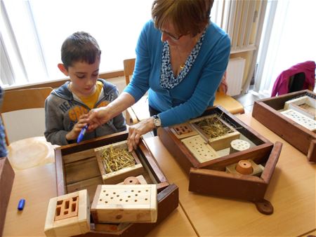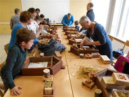 12 kinderen bouwden vandaag onder leiding van KWB Heusden Centrum een leuk bijenhotel dat nadien thuis in de tuin een plaatsje krijgt. Terwijl ze genoten van een hot-dog kregen ze ook uitleg over het nut van de bijenhotels. Zo zijn er meer dan 300 soorten solitaire bijen die maar al te graag gebruik maken van kleine gaatjes en spleetjes om hun eitjes te leggen. Zij leven dus niet in kolonies zoals de alom gekende bijen en wespen die we in de zomer overal tegenkomen. Ze zijn ook veel vredelievender en dus ideale gasten voor in de tuin.24866