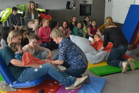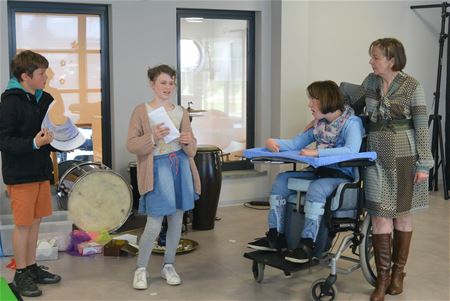 De vijfdeklassers van de Vrije lagere school Berkenbos bezochten het dagcentrum ‘t Trapke in Het Weyerke. Ze fietsten er naartoe begeleid door de KWB Berkenbos. Na een korte uitleg over de werking van het Trapke mochten de kinderen een les ontspanningsoefeningen meevolgen. Ze waren onder de indruk van de rust en de eenvoud. Nadien gingen ze in gesprek met Lieselot, eenvoudige vragen en antwoorden, met een lach. Op het einde van het bezoek overhandigden Hanne en Hannes het sponsorgeld aan de directie van ‘t Trapke, de opbrengst van de sponsorloop.25051