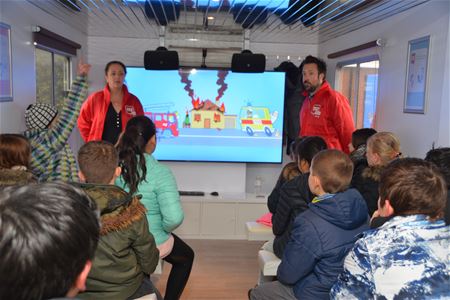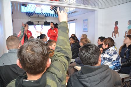 Niet alleen volwassenen moeten op een goede manier de hulpdiensten kunnen bellen, ook kinderen kunnen vaak in een toestand verzeild raken waarbij ze professionele hulp moeten kunnen oproepen. Daarom rijdt de 112 Kids Campagnebus van de overheid door het land. Vandaag was ze te gast bij lagere school De Brug. De leerlingen van het 4de tot en met 6de leerjaar kregen daar met een filmpje en spelletjes uitleg over hoe ze efficiënt de noodcentrale moeten bellen. Voor de uitleg zorgden Esther en Leighton, beiden in het dagelijkse leven 112-operatoren in Hasselt. Uit het leven gegrepen dus. (foto's Marina Poelmans)39458