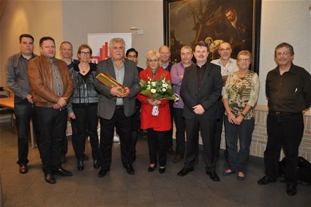 De middenstandsraad heeft dinsdagavond op een feestelijke wijze Eddy Daniels uitgezwaaid. Eddy was 34 jaar voorzitter van het handelscentrum Cité en organiseerde evenveel keer de braderie. Dit jaar - de zestigste - was voor hem meteen de laatste als organisator. Hij zette destijds ook de eerste 'dag van de klant' op. Niet alleen was hij bestuurslid op de Cité, hij was in Berkenbos ook dorpsraadvoorzitter, lid en voorzitter van de gemeentelijke middenstandsraad en bij NCMV (nu UNIZO) was hij zowel op lokaal, provinciaal als nationaal vlak actief. Ook zijn vrouw Nicole werd in de hulde betrokken. Eddy is wel nog altijd actief als 'agent' in dameskleding.11844