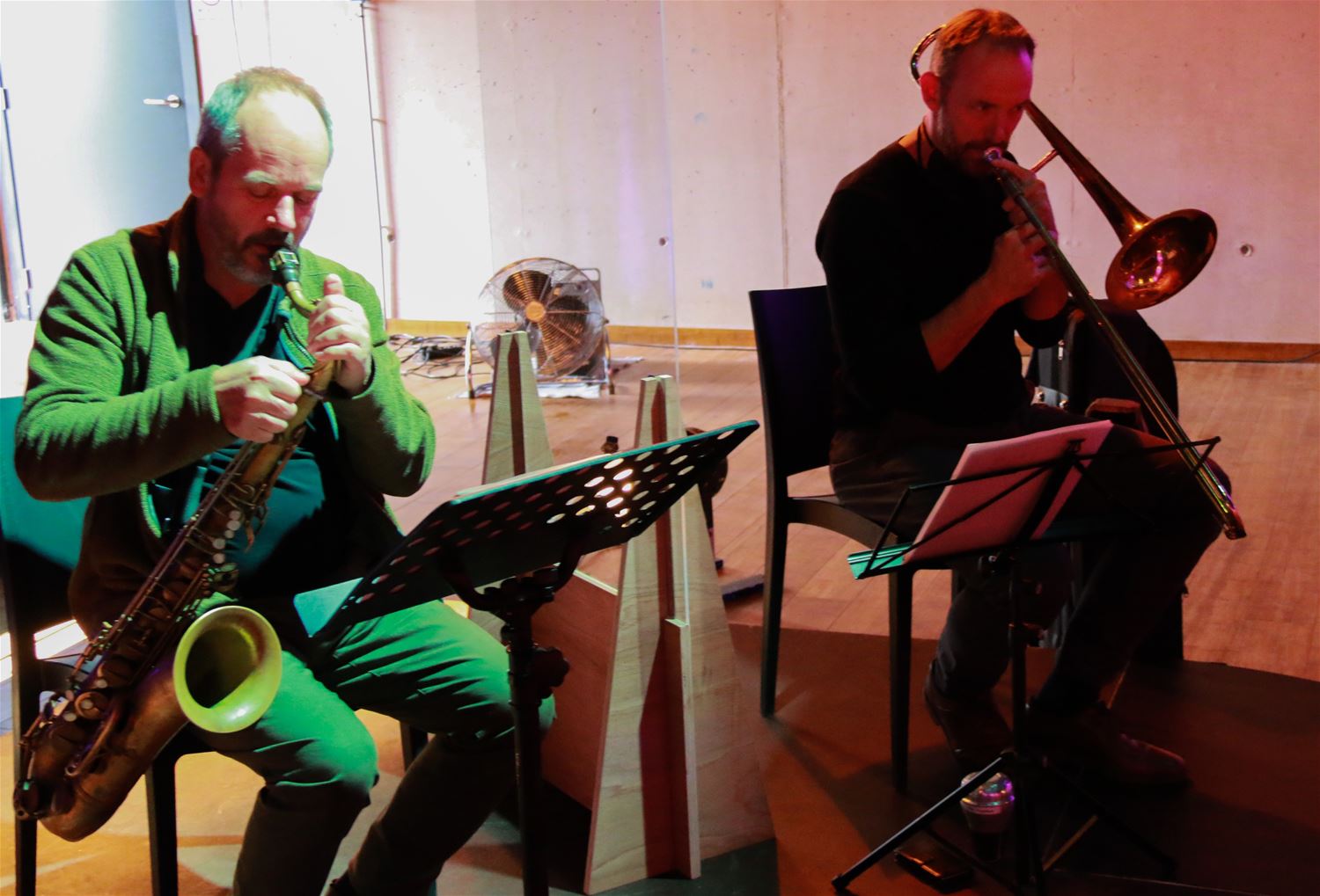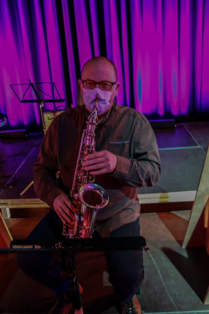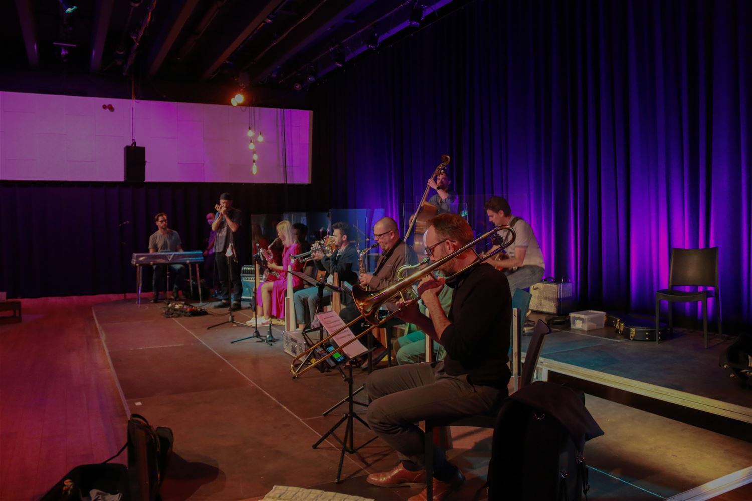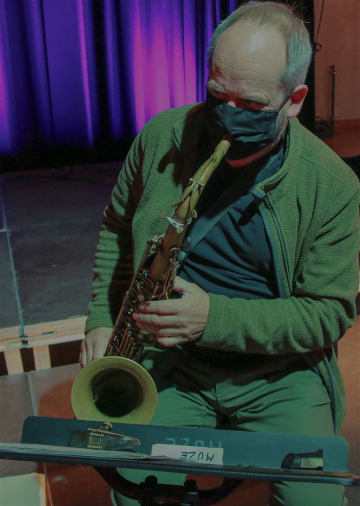 Vanavond had in de balzaal van Muze - omgevormd tot een café - de eerste van een reeks jubileumconcerten voor de 10de verjaardag van de Muze Jazz Orchestra plaats. Special guest was Steven De bruyn en samen brachten ze onder meer een herwerking van hun Suite voor de Laatste Mijn. Tussendoor zorgden de mondmaskers voor enige hilariteit. 60 jazzliefhebbers vulden de bubbelplaatsen in de balzaal. (foto's Ria De Clerck)