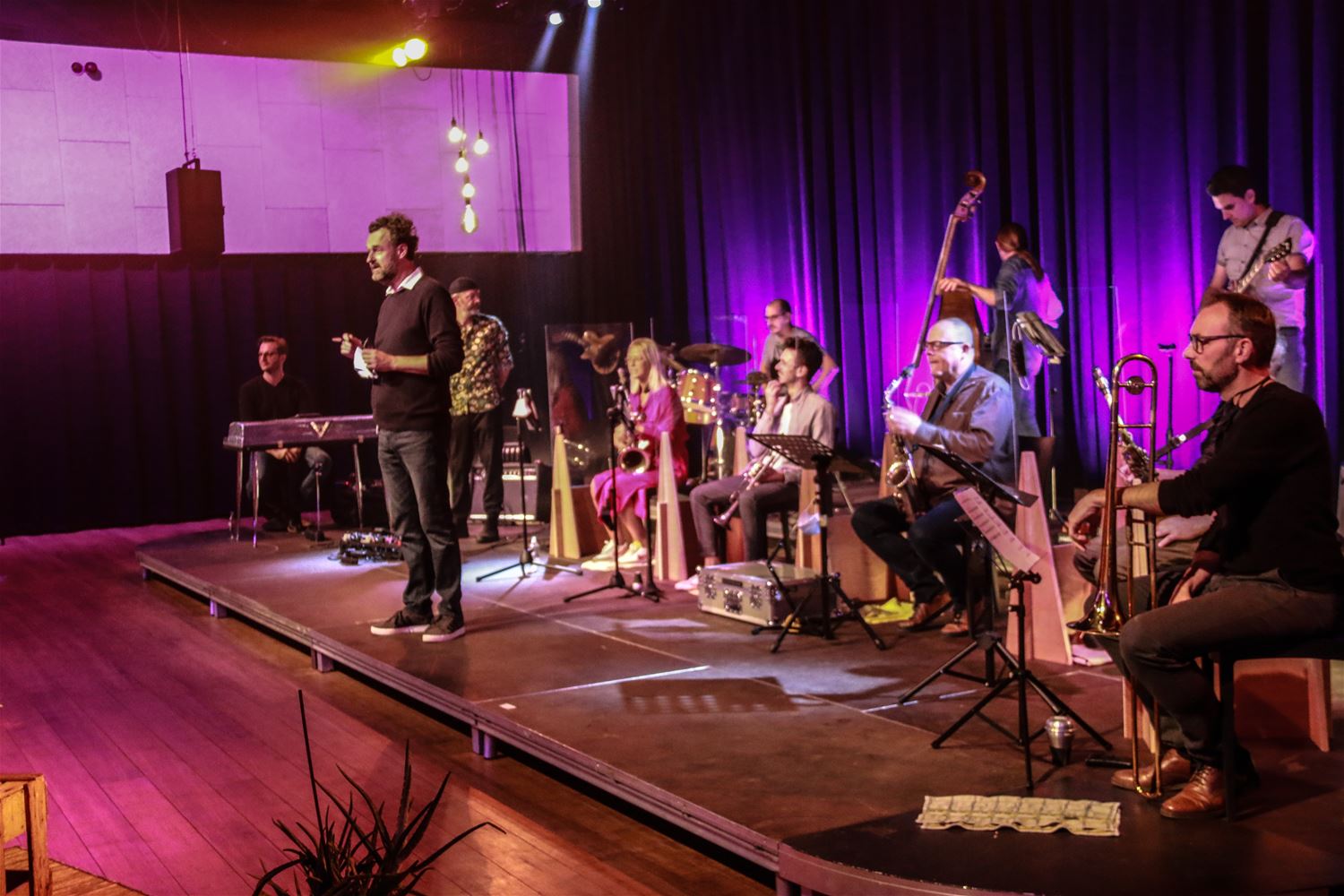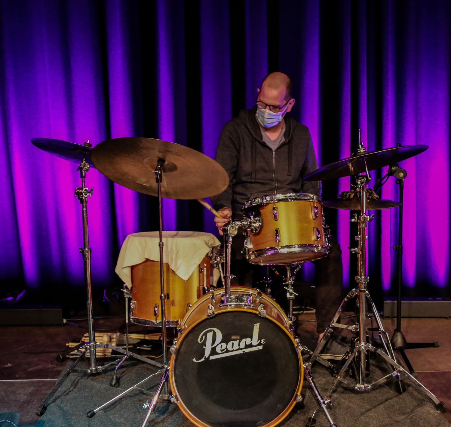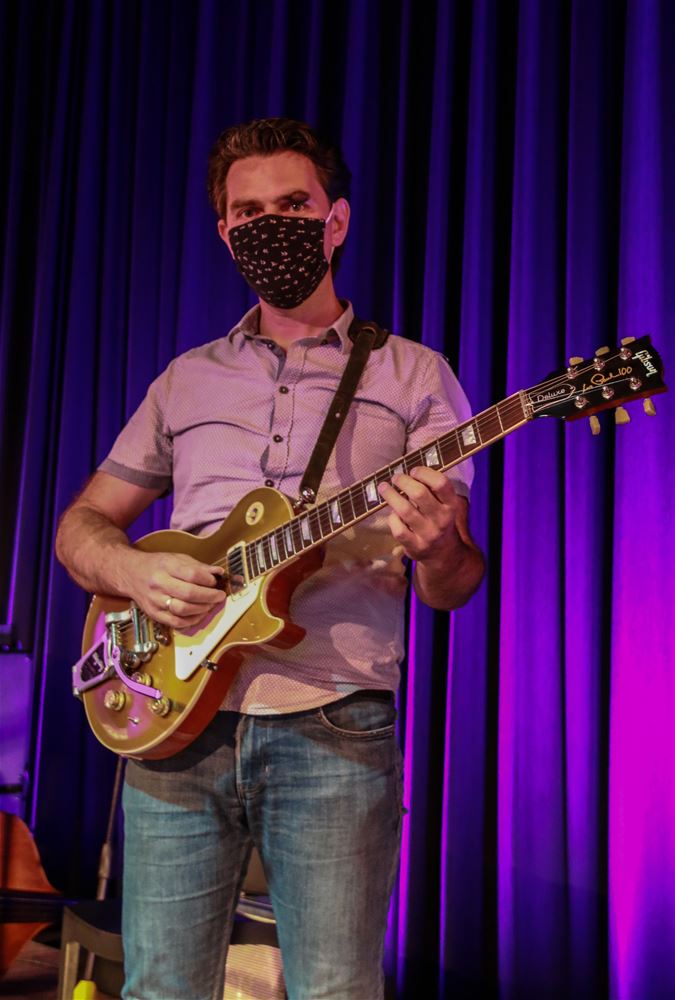 Vanavond had in de balzaal van Muze - omgevormd tot een café - de eerste van een reeks jubileumconcerten voor de 10de verjaardag van de Muze Jazz Orchestra plaats. Special guest was Steven De bruyn en samen brachten ze onder meer een herwerking van hun Suite voor de Laatste Mijn. Tussendoor zorgden de mondmaskers voor enige hilariteit. 60 jazzliefhebbers vulden de bubbelplaatsen in de balzaal. (foto's Ria De Clerck)