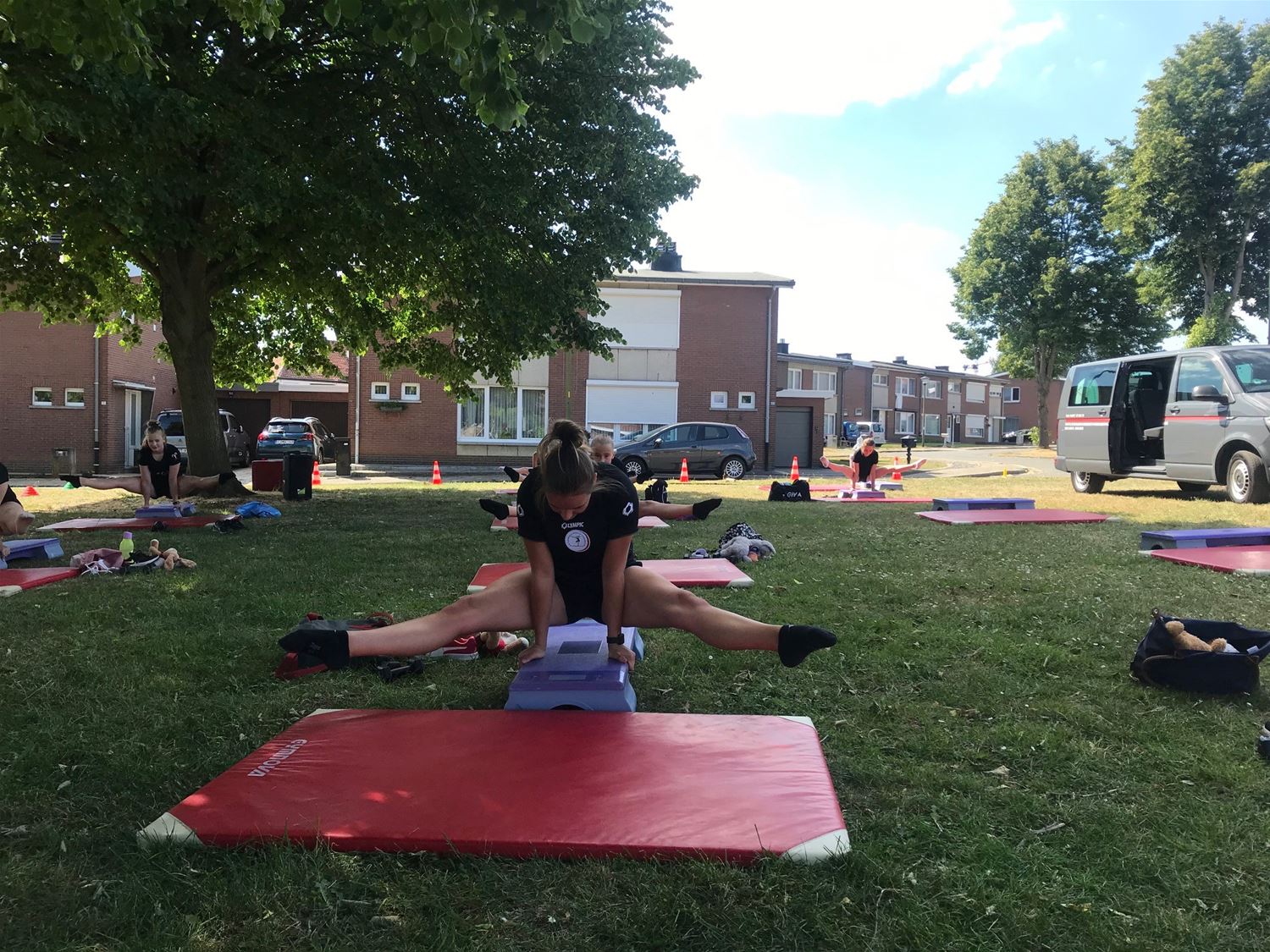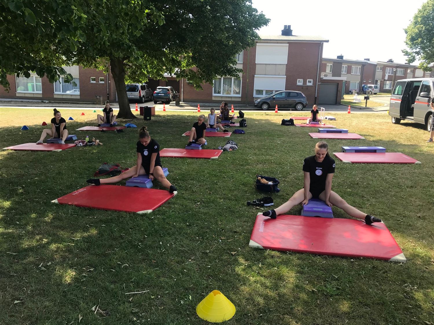 In de sporthallen liggen nog alle activiteiten stil, maar turnkring Moed en Volharding hield vanavond een en eerste outdoortraining. Daarvoor bracht trainer Luk Van Gompel zijn troepen samen op het pleintje voor zijn woning in Beringen. Voor hem was het thuiswerk, voor de turnsters even een andere omgeving dan Berkenbos. "Het was zwaar, we hebben gezweet, maar het was ook leuk en we keken er naar uit om elkaar terug te zien," besloot Luk achteraf. (foto's Hans Put)