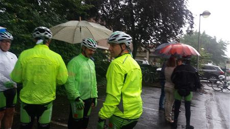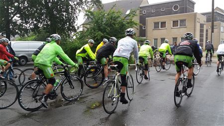 De wielertoeristenclub KWB Sint-Baaf Eversel is vanmorgen naar jaarlijkse gewoonte vertrokken voor een tweedaagse rit. Deze keer naar Gent. En de moedige fietsers laten zich niet afschrikken door het weer. Een enorme stortbui stak even stokken in de wielen en vertraagde de start met een half uur. Maar dan kwam de groep op gang voor de heentrip van 165 km. Morgenavond worden ze terug verwacht. (foto's Rita Vanhove)27692