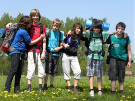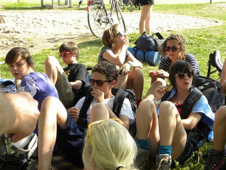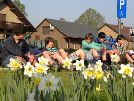 Vandaag trokken de collegeleerlingen meer naar het zuiden. Het traktatiepunt lag in De Luman in Lummen. Het heeft meer en meer weg van een tropische tocht dan van een paasvakantie-activiteit. Bij sommige leerlingen laten de vermoeidheid en de warmte dan ook hun sporen achter. Anderzijds is het onderweg des te mooier, met veel bloemen in de natuur. In de vooravond kwamen ze aan in de Gildezaal in Kuringen. En in die buurt wordt ook de nacht doorgebracht. (foto's Jan De Decker)