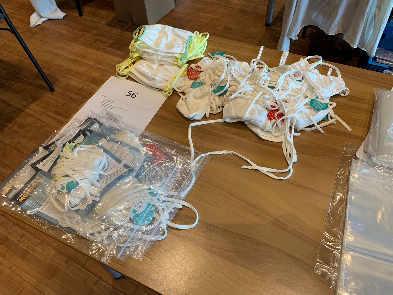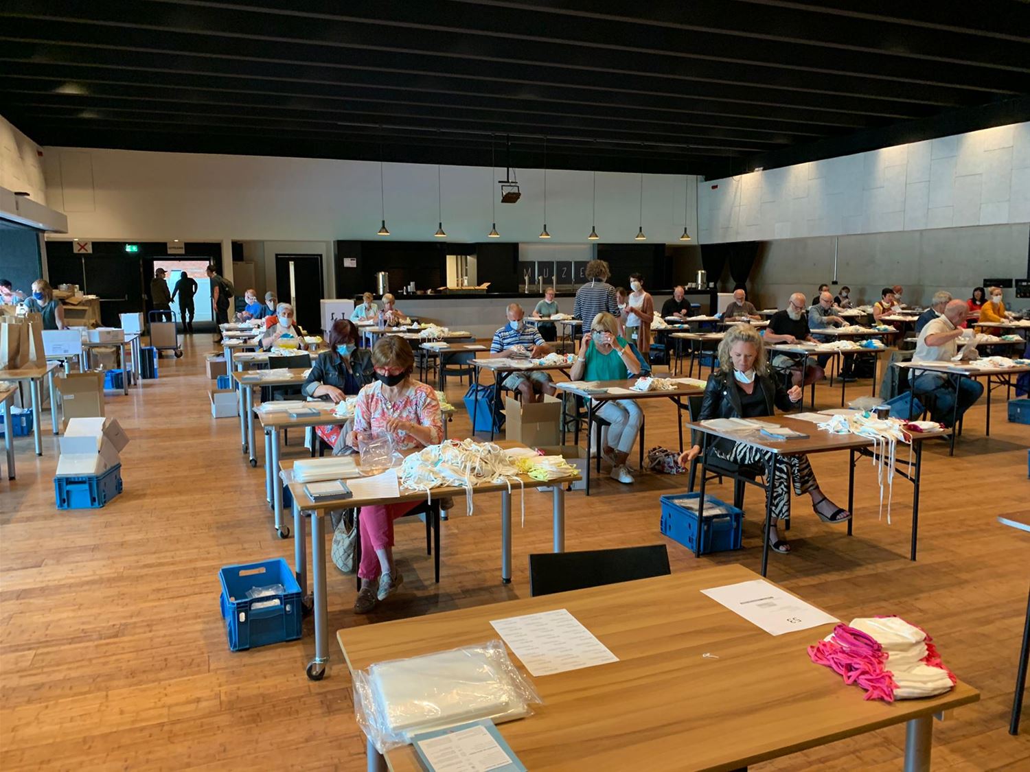 Een honderdtal personeelsleden van de gemeente en vrijwilligers van de dorpsraden zijn in CC Muze volop aan de slag om de mondmaskers voor de bevolking te verpakken. Daarvoor is zowel de balzaal als de zwarte zaal ingenomen. Het is een hele klus om in het totaal meer dan 33.400 maskers te verpakken, want het moet het exacte aantal per adres zijn en ook rekening houdend met het aantal kinderen boven de drie jaar. Morgen trekken ze er met nog meer volk op uit om bij iedereen aan te bellen om de mondmaskers te overhandigen. (foto's Julien Maebe)