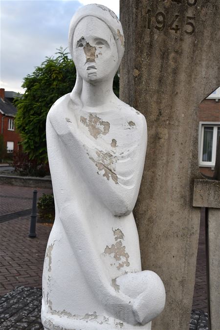 Er staan dezer dagen heel wat activiteiten op het programma om de honderdste verjaardag van het einde van de Eerste Wereldoorlog te herdenken. Alleen trekt zich blijkbaar niemand het lot van het herdenkingsmonument in Heusden aan. Dat is precies opgericht ter nagedachtenis van de oorlogsslachtoffers. Meer dan 3 jaar geleden is het beschadigd door vandalen. De neus van de 'treurende weduwe' is toen afgebroken. Sindsdien is het beeld alleen maar verder verloederd. Daar moet op 11 november nochtans ook een plechtigheid gehouden worden ... UPDATE Gisteren lag het monument er nog verloederd bij, maar vandaag heeft gemeentepersoneel er een nieuwe verflaag op gezet. De neus is nog niet hersteld, daarvoor wordt overlegd met de kunstenaar en de academie.