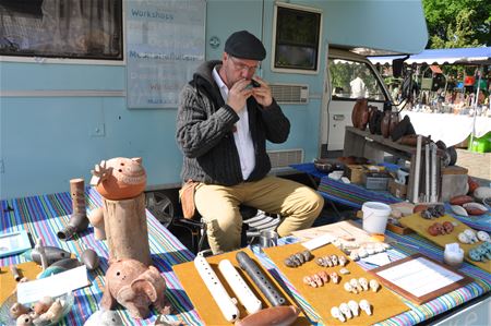 Op domein Bovy had vandaag de eerste dag van de keramiekdriedaagse plaats. Zaterdag is traditiegetrouw de meest rustige dag. De standhouders etaleren wel een bijzonder gevarieerd aanbod, van functionele, bruikbare spullen tot decoratieve keramiek voor de woonkamer of de tuin. Opvallend ook de vele vrolijke kleuren. Eén van de kunstenaars liet je wegdromen met zijn zenfluiten, bij een ander kwam de raku-oven op temperatuur. Bob Vincke tekende karikaturen van de bezoekers. Het weer was nog wat wisselvallig, waardoor helaas ook een tentje samen met enkele werkjes een windstoot moest incasseren. Ook zondag en maandag kan je nog de hele dag terecht op het centrale gedeelte van Bovy. De toegang is gratis. (meer foto's)26292