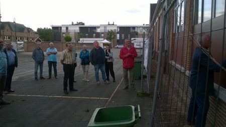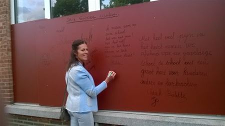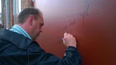 De oproep van de Handelaars Heusden-Dorp om vanavond afscheid te komen nemen van de oude jongensschool, werd vooral opgevolgd door ex-leerkrachten en -directeurs. Ze schreven op de panelen herinneringen en blikten met nostalgie terug op een tijd die ondertussen vervlogen is, en die binnenkort ook letterlijk uit het dorpsbeeld wordt weggeveegd. (foto's Julien Maebe)27821