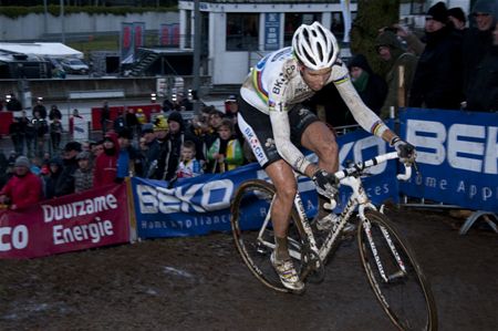 Sven Nys heeft een immens spannende verldrit bij de eliterenners gewonnen. In de slotronde schudde hij Niels Albert af die tweede werd. Dankzij zijn zege komt Nys in de stand op gelijke hoogte van Albert, met 415 punten. Voor de Belgische kampioen is het zijn derde wereldbekerzege dit seizoen. Zdenek Stybar stond opnieuw aan de start en de Tsjechische kampioen was goed weg, terwijl Kevin Pauwels zijn start compleet miste. Hij maakte een sterke remonte en werd zo nog vijfde. Derde was Stybar, vierde Simunek. Er was heel wat volk opgedaagd voor het cyclocrossgebeuren in Heusden-Zolder, zowat 15.000 toeschouwers. Maar vooral de veldrit van de profs werd geteisterd door striemende regen. (foto's Jan Leijskens)
